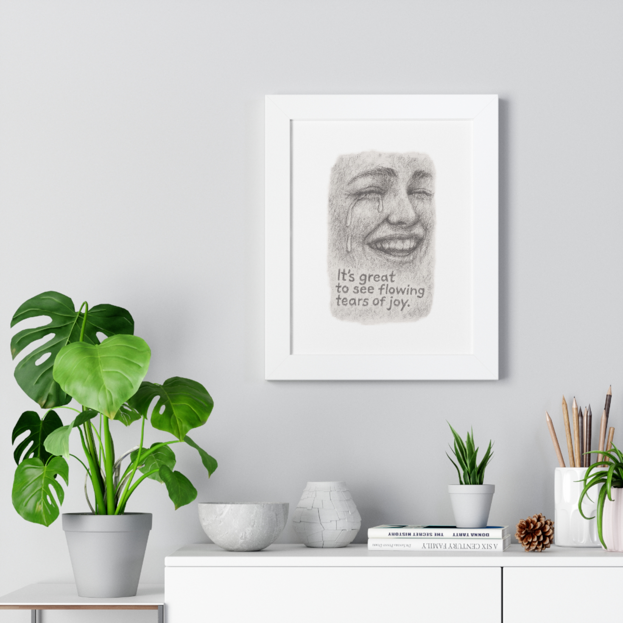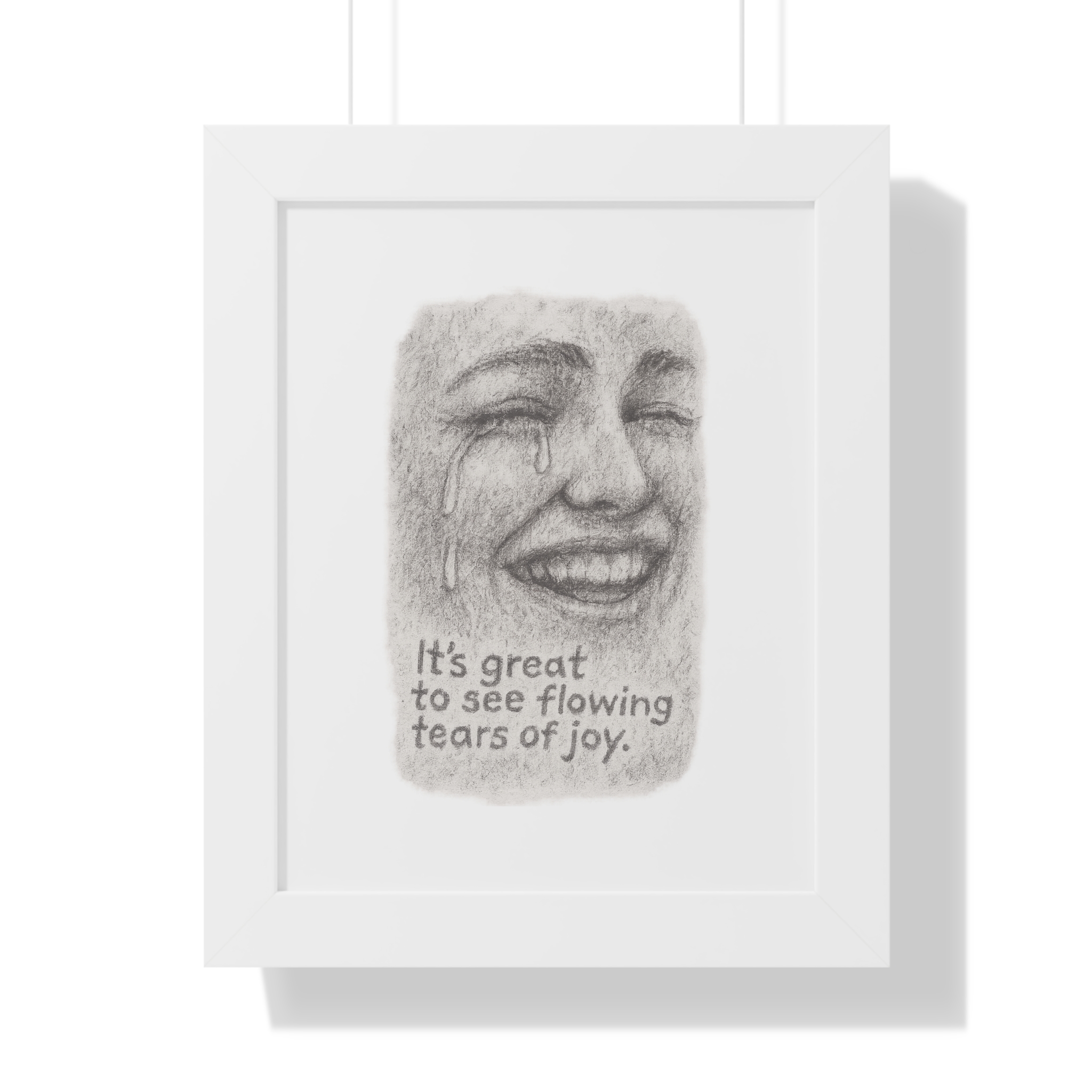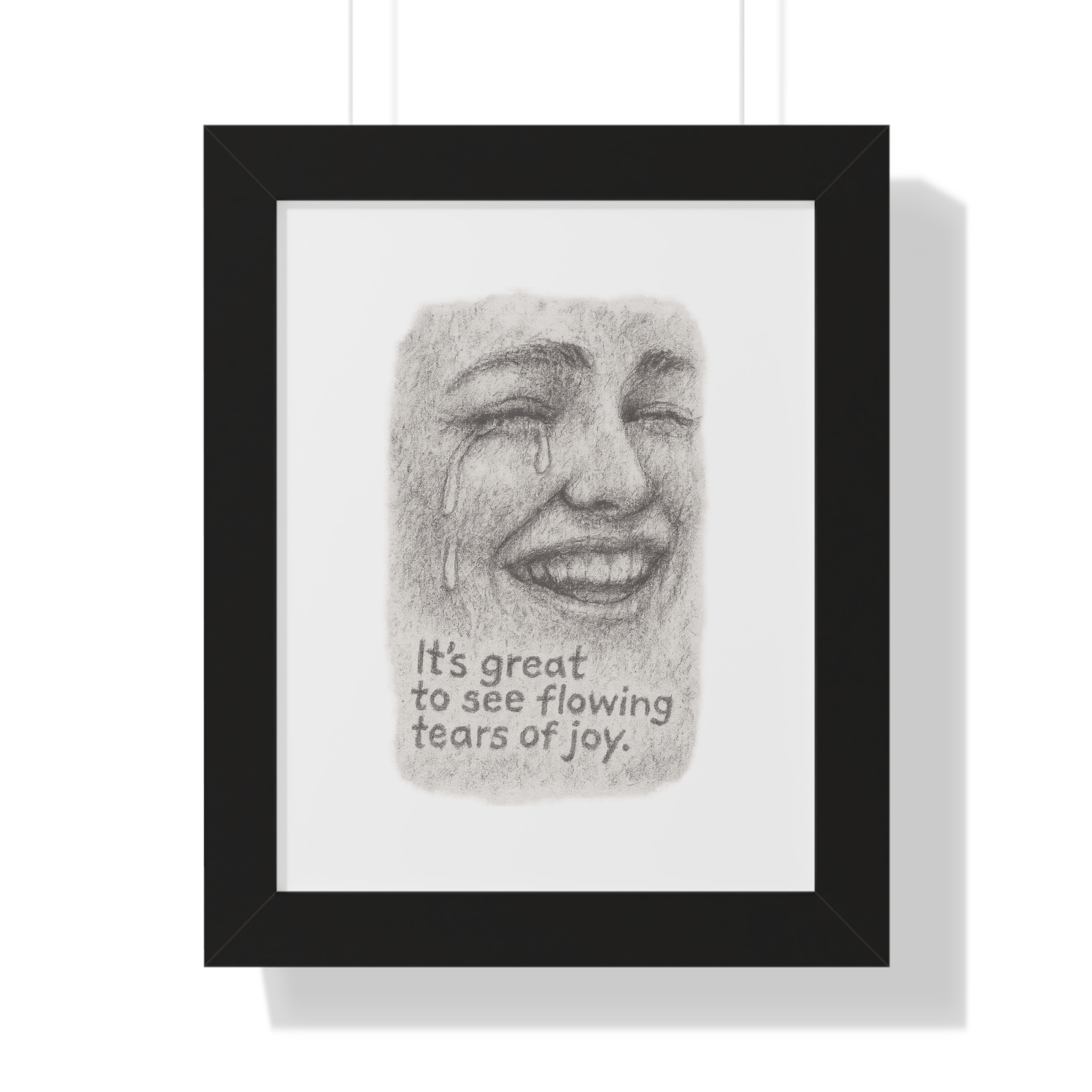 A quietly powerful framed vertical poster that pairs archival-grade, museum matte paper with a slim, elegant frame. The pencil-style portrait captures a bittersweet smile with tears of joy, paired with the understated line “It’s great to see flowing tears of joy.” The muted grayscale artwork sits beneath a protective acrylic cover and is offered in three frame finishes—black, walnut, or white—so it slips into modern, minimal, or cozy interiors. Lightweight but sturdy, the frame arrives ready to hang with built-in hardware (or included hanging pieces), so the piece can be mounted on a gallery wall, a bedside nook, or above a reading chair. This print brings a contemplative, empathetic presence to spaces where emotion and memory are honored.
