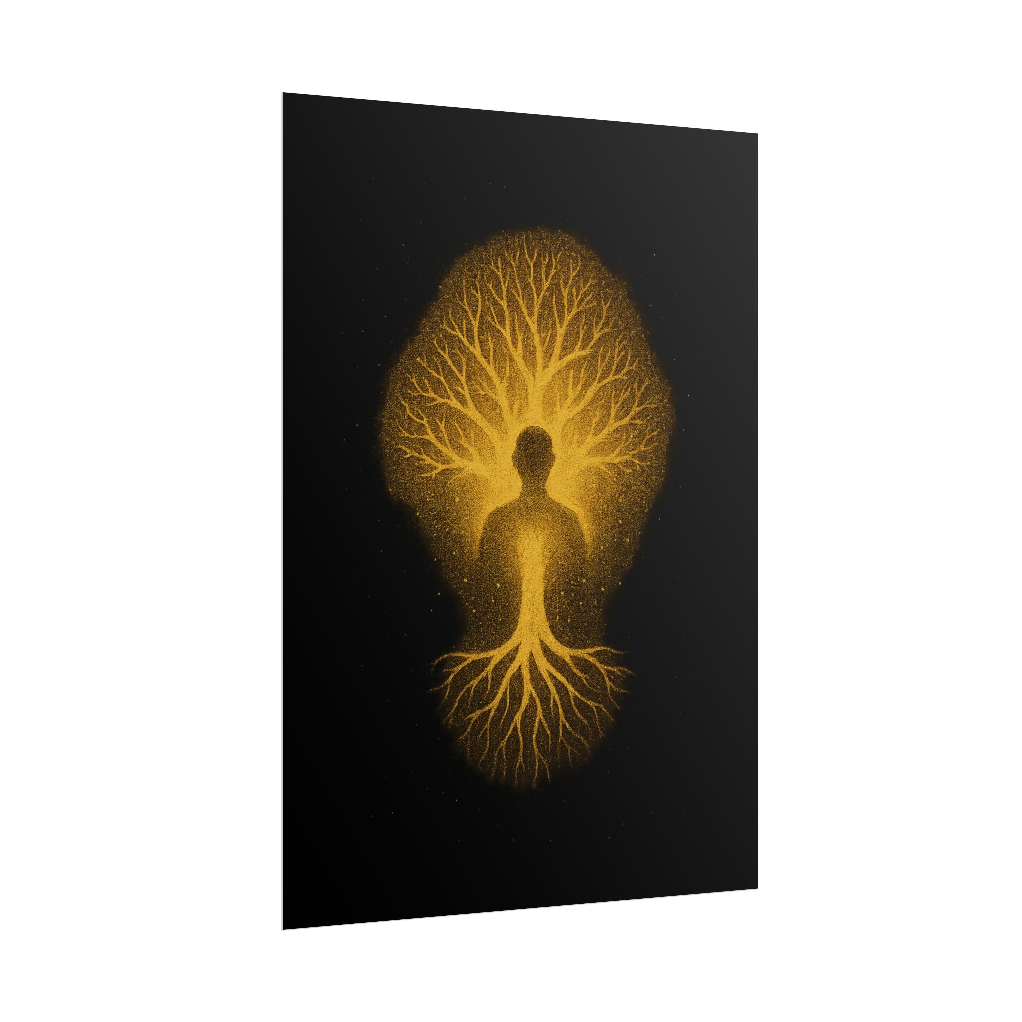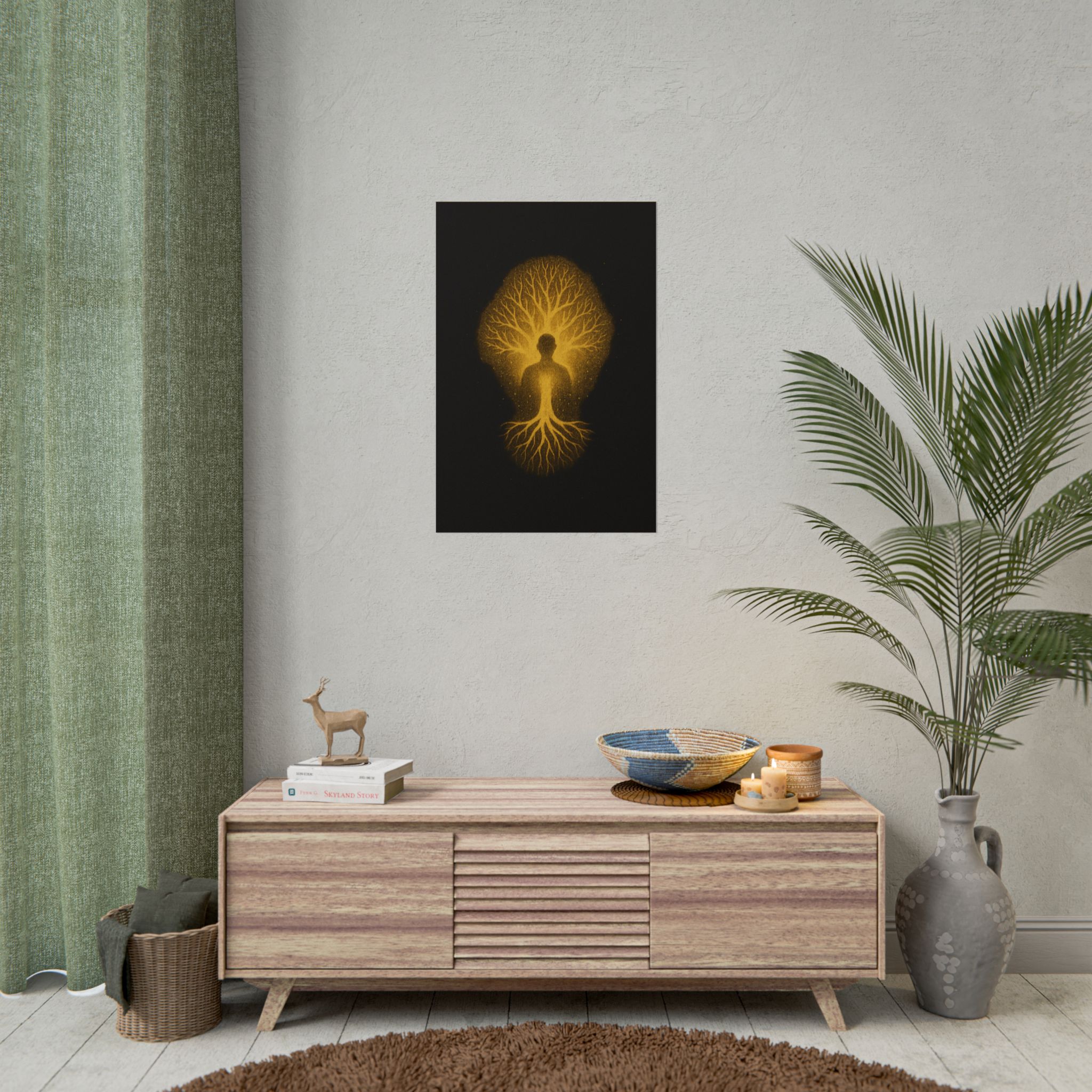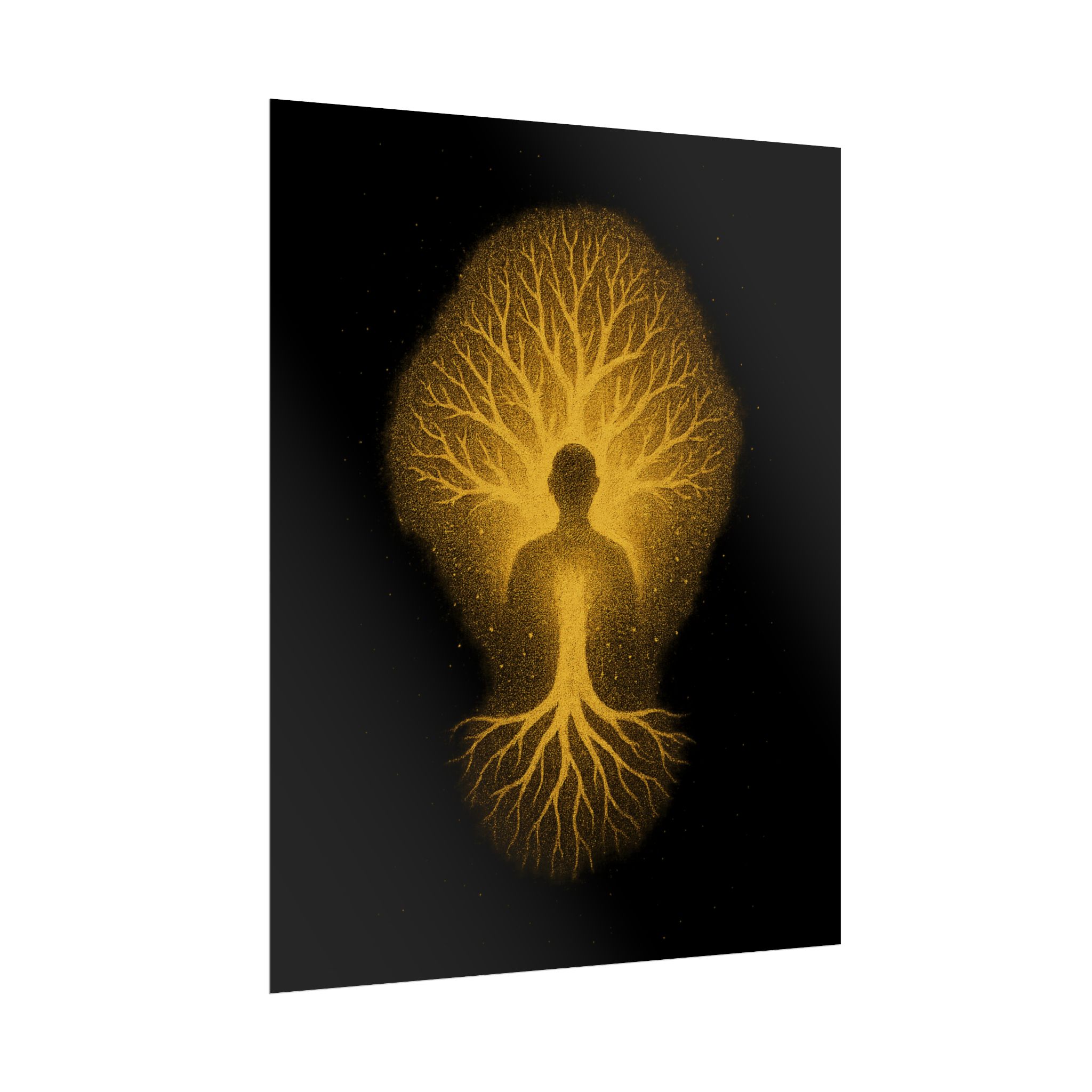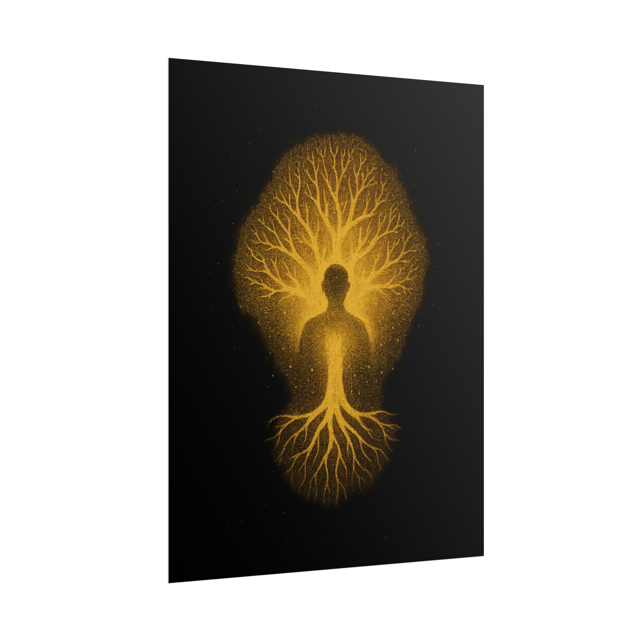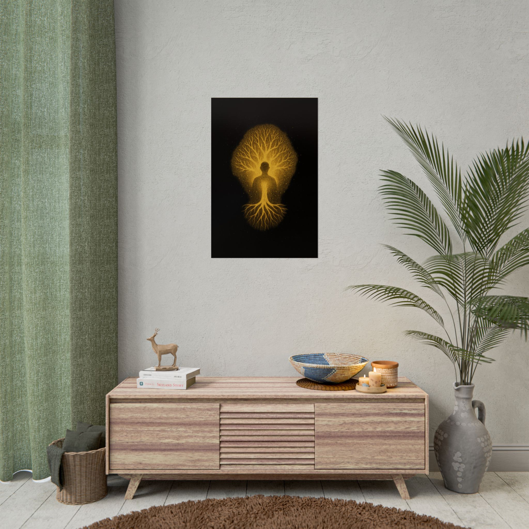 A rolled art print that brings a quiet, meditative energy into any room. The glowing gold silhouette melds a human figure with a branching tree of roots and crown, printed on your choice of fine art, semi-glossy, or matte paper. Colors are produced with giclée printing for vivid, lasting pigment so the luminous gold remains striking under regular light. Shipped rolled to protect the paper and easy to frame or pin up as-is, this print suits both vertical and horizontal displays and comes in multiple sizes to fit walls small and large.