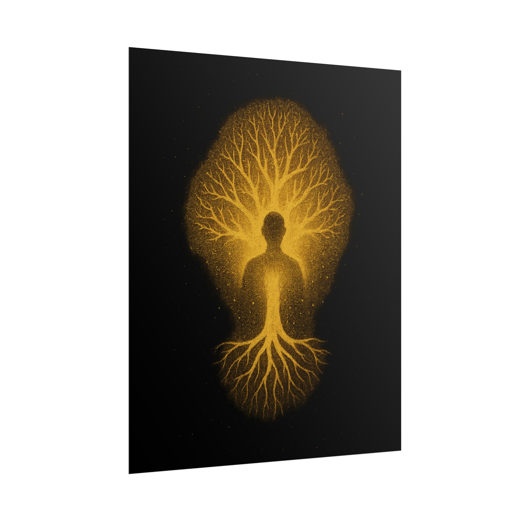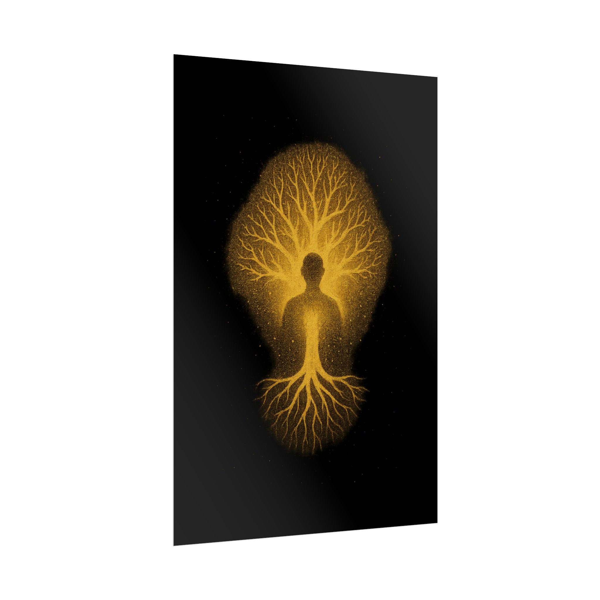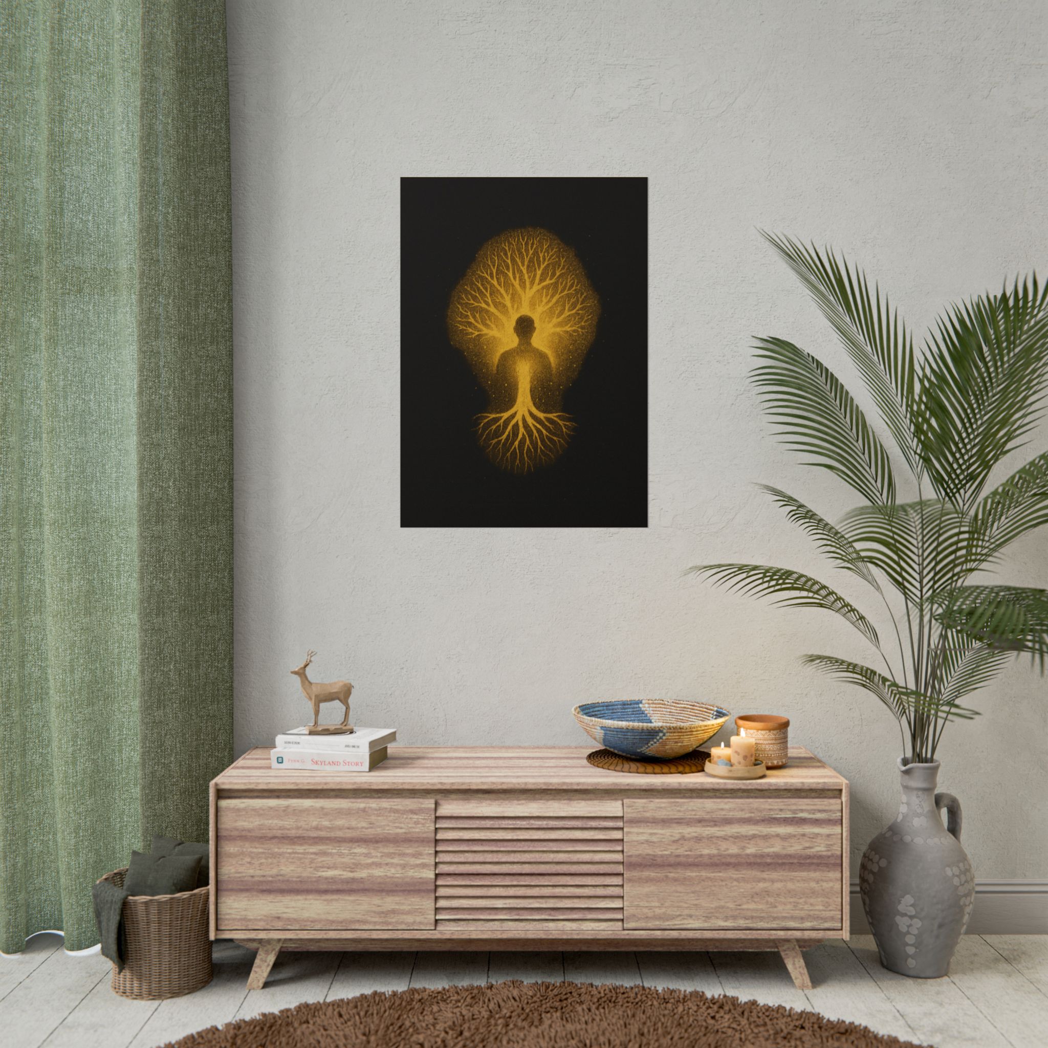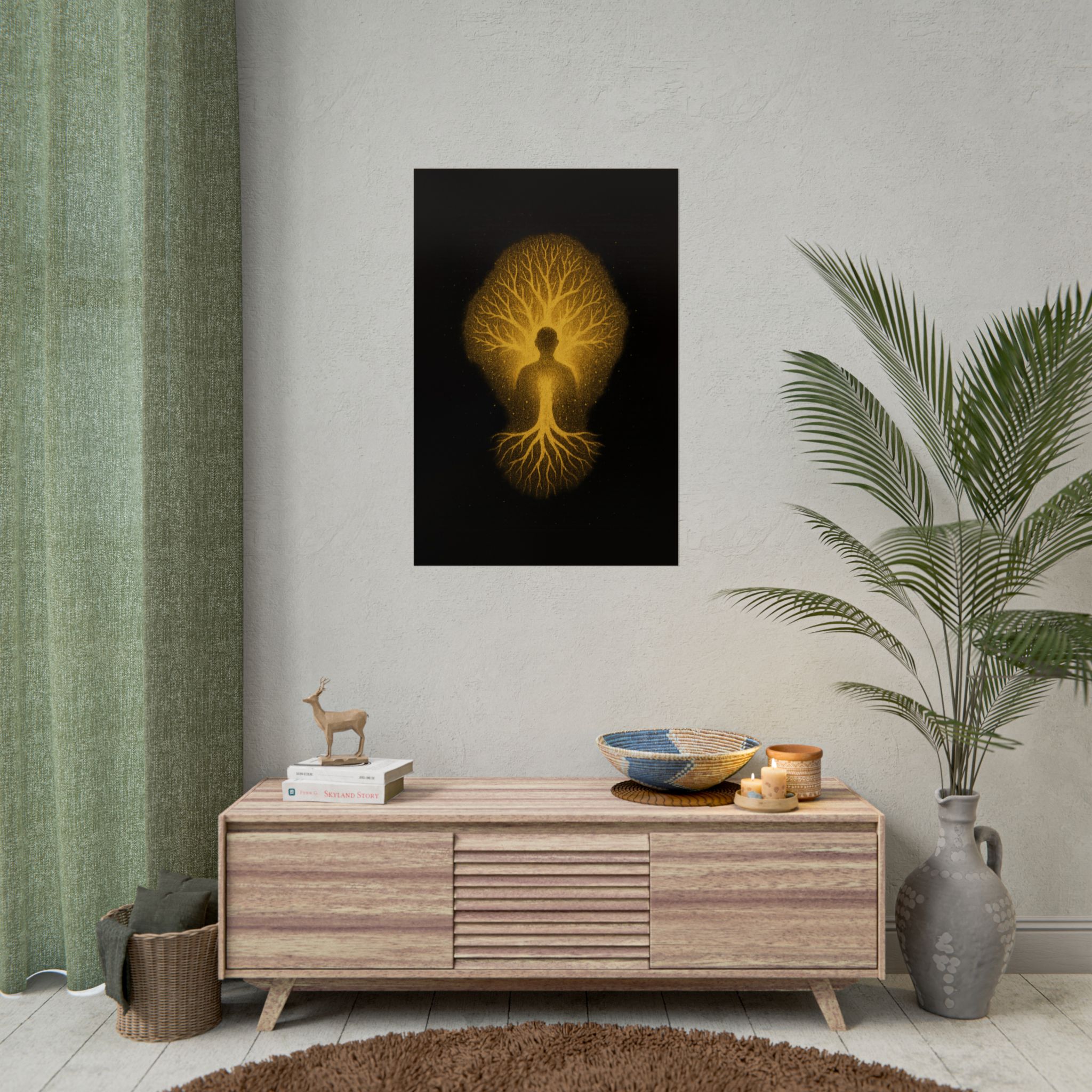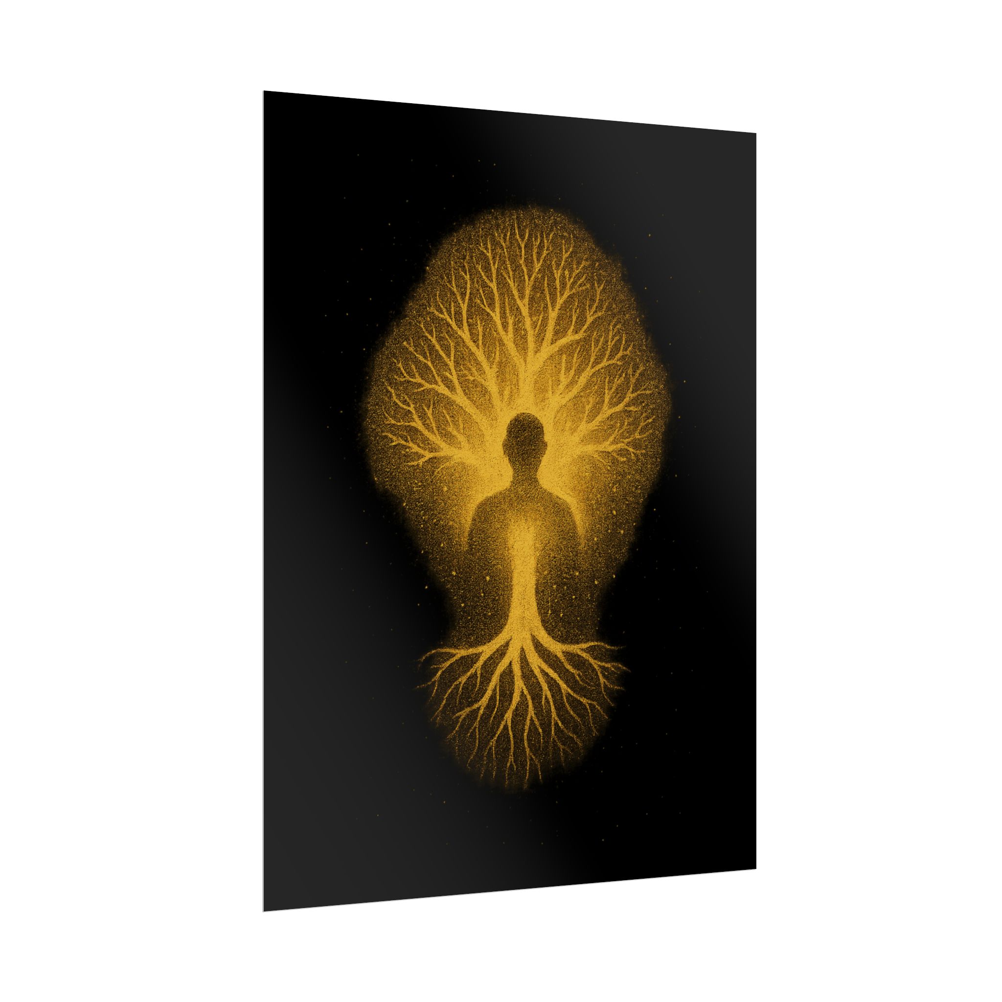 A rolled art print that brings a quiet, meditative energy into any room. The glowing gold silhouette melds a human figure with a branching tree of roots and crown, printed on your choice of fine art, semi-glossy, or matte paper. Colors are produced with giclée printing for vivid, lasting pigment so the luminous gold remains striking under regular light. Shipped rolled to protect the paper and easy to frame or pin up as-is, this print suits both vertical and horizontal displays and comes in multiple sizes to fit walls small and large.