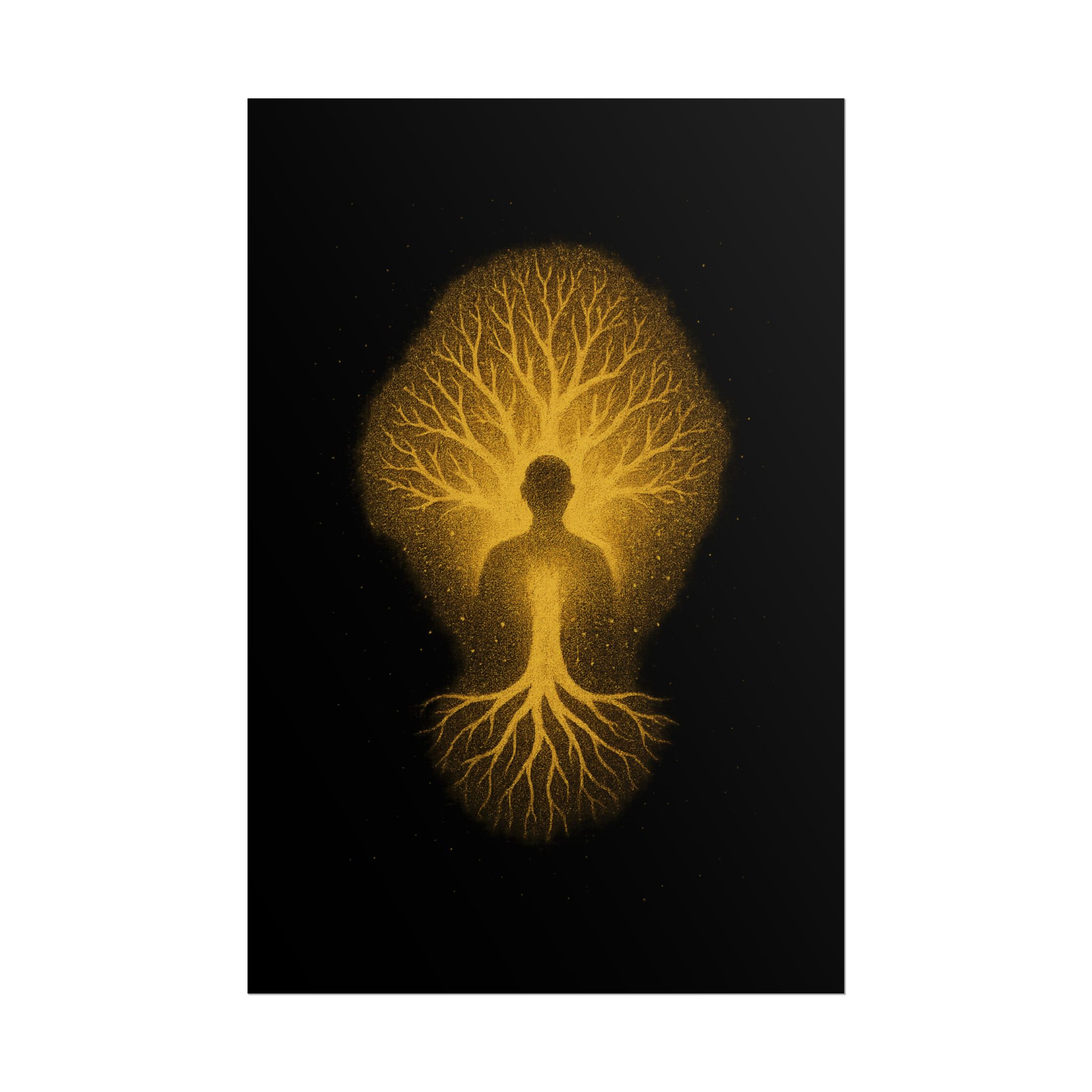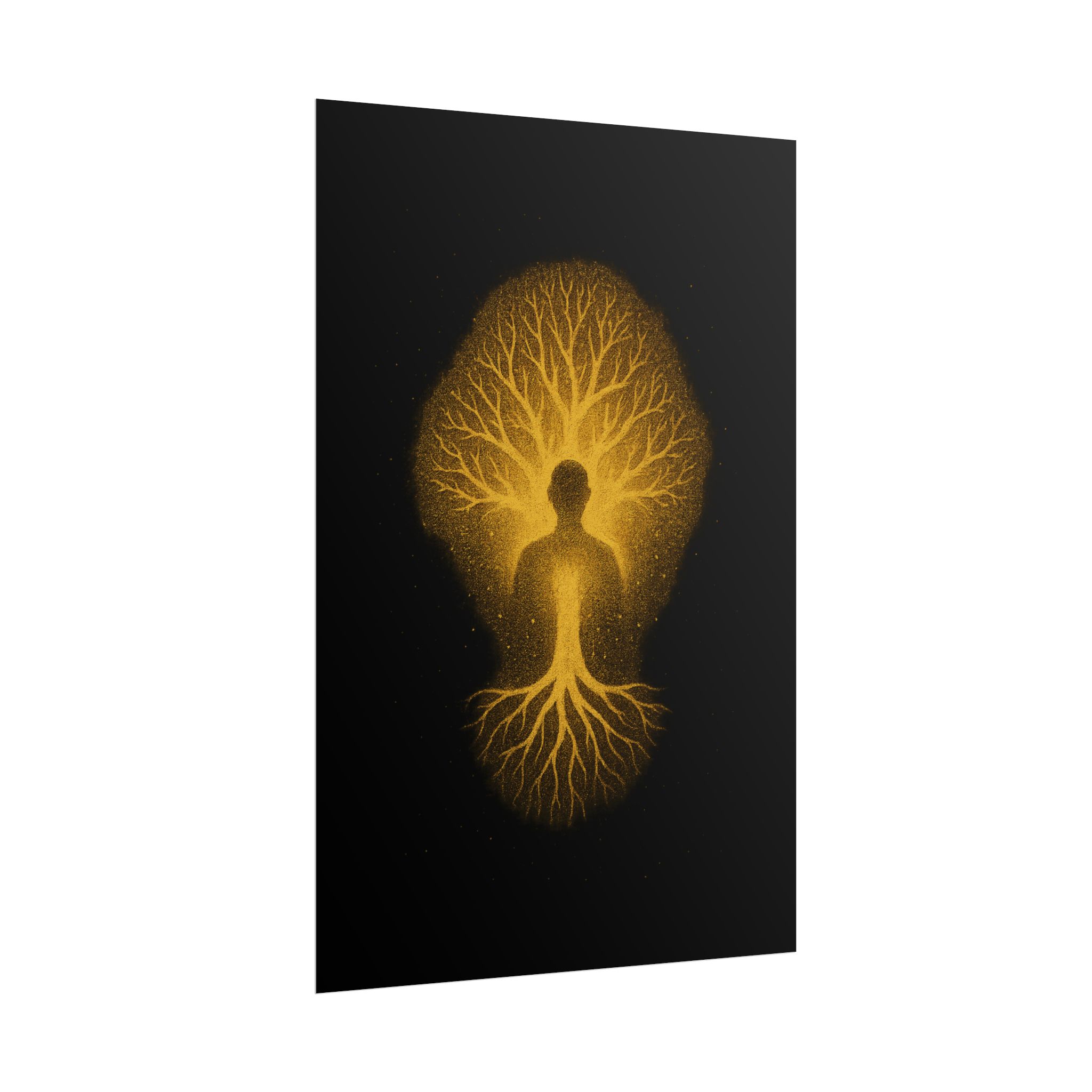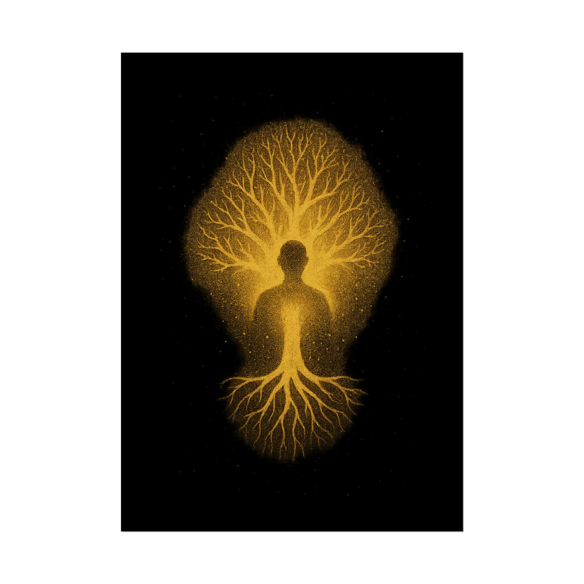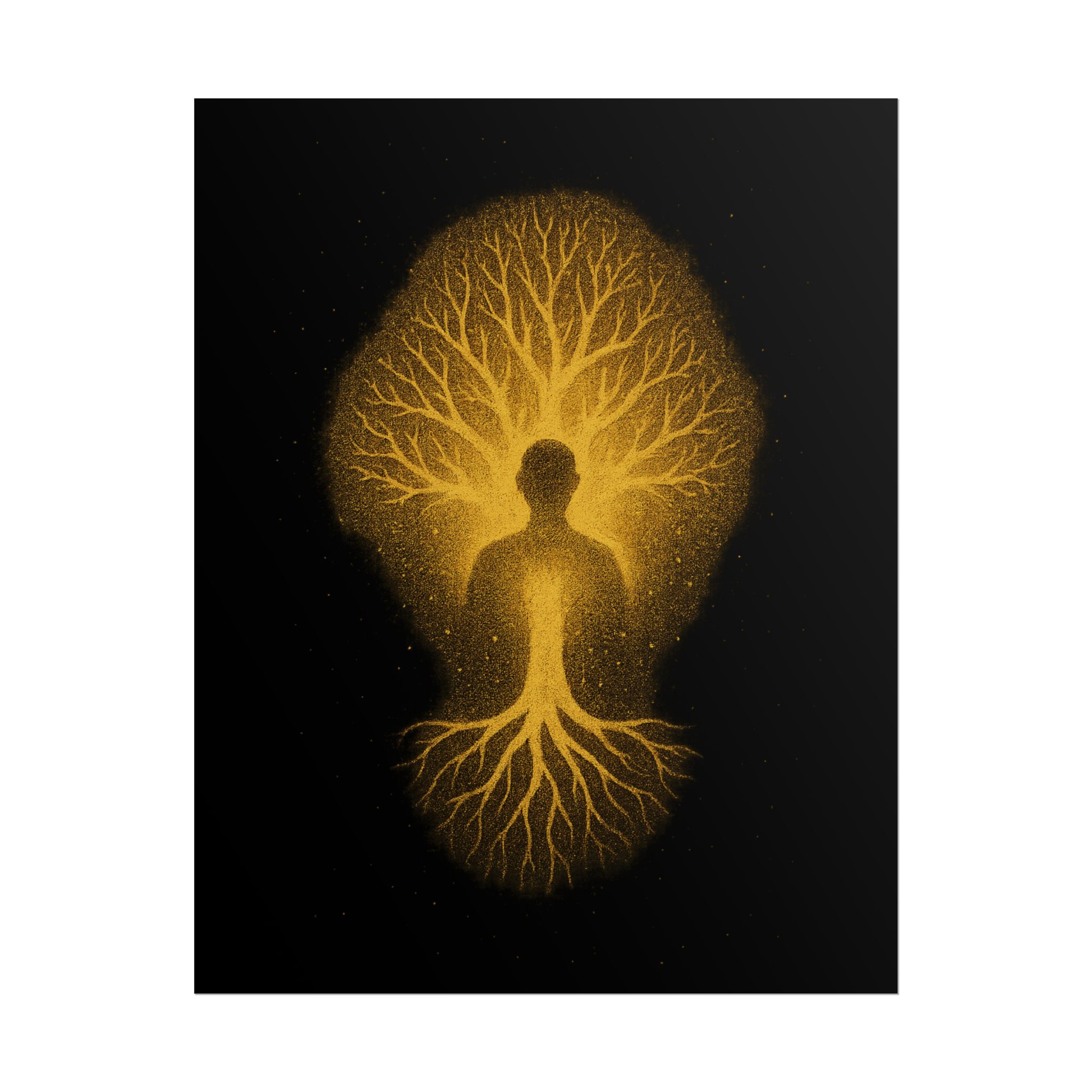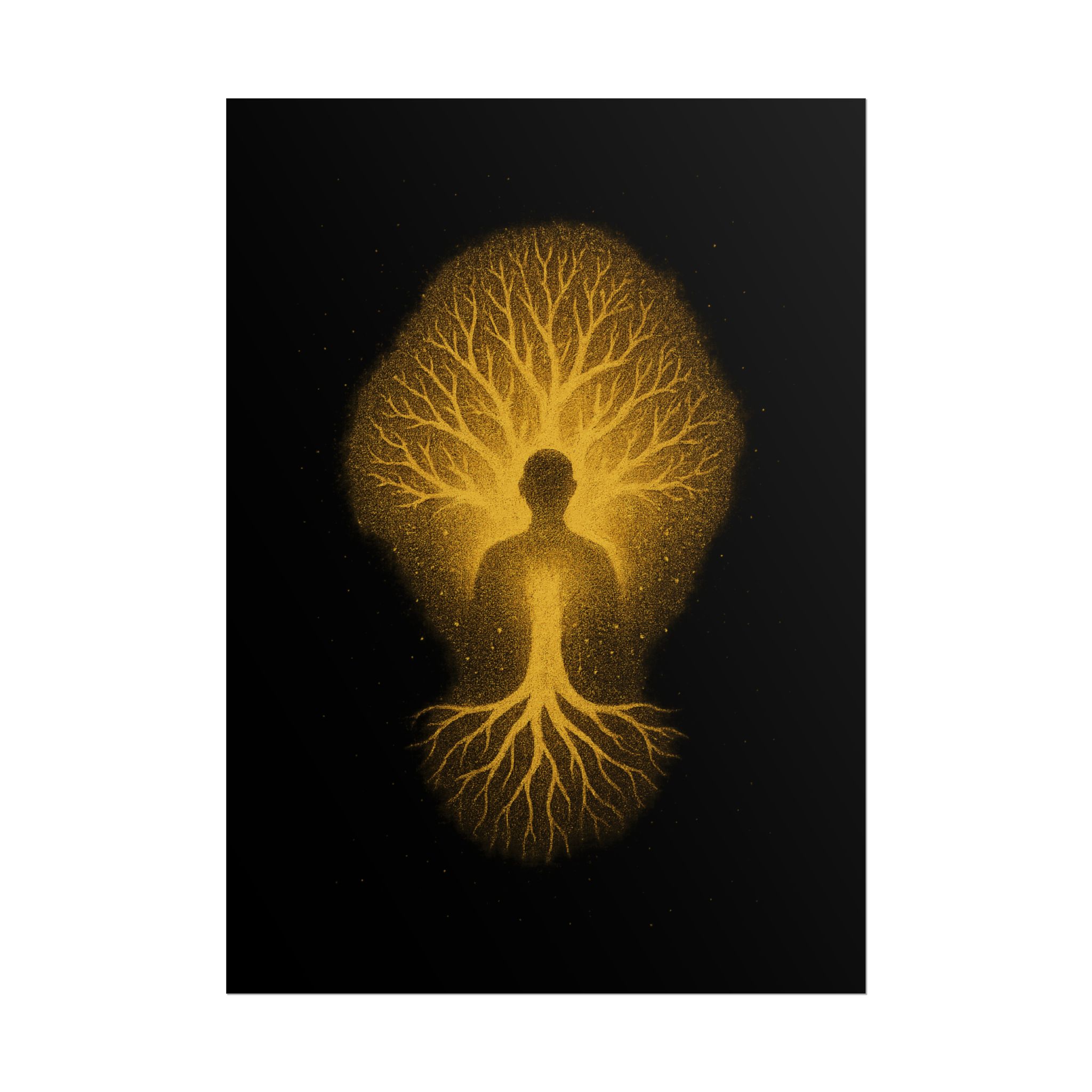 A rolled art print that brings a quiet, meditative energy into any room. The glowing gold silhouette melds a human figure with a branching tree of roots and crown, printed on your choice of fine art, semi-glossy, or matte paper. Colors are produced with giclée printing for vivid, lasting pigment so the luminous gold remains striking under regular light. Shipped rolled to protect the paper and easy to frame or pin up as-is, this print suits both vertical and horizontal displays and comes in multiple sizes to fit walls small and large.