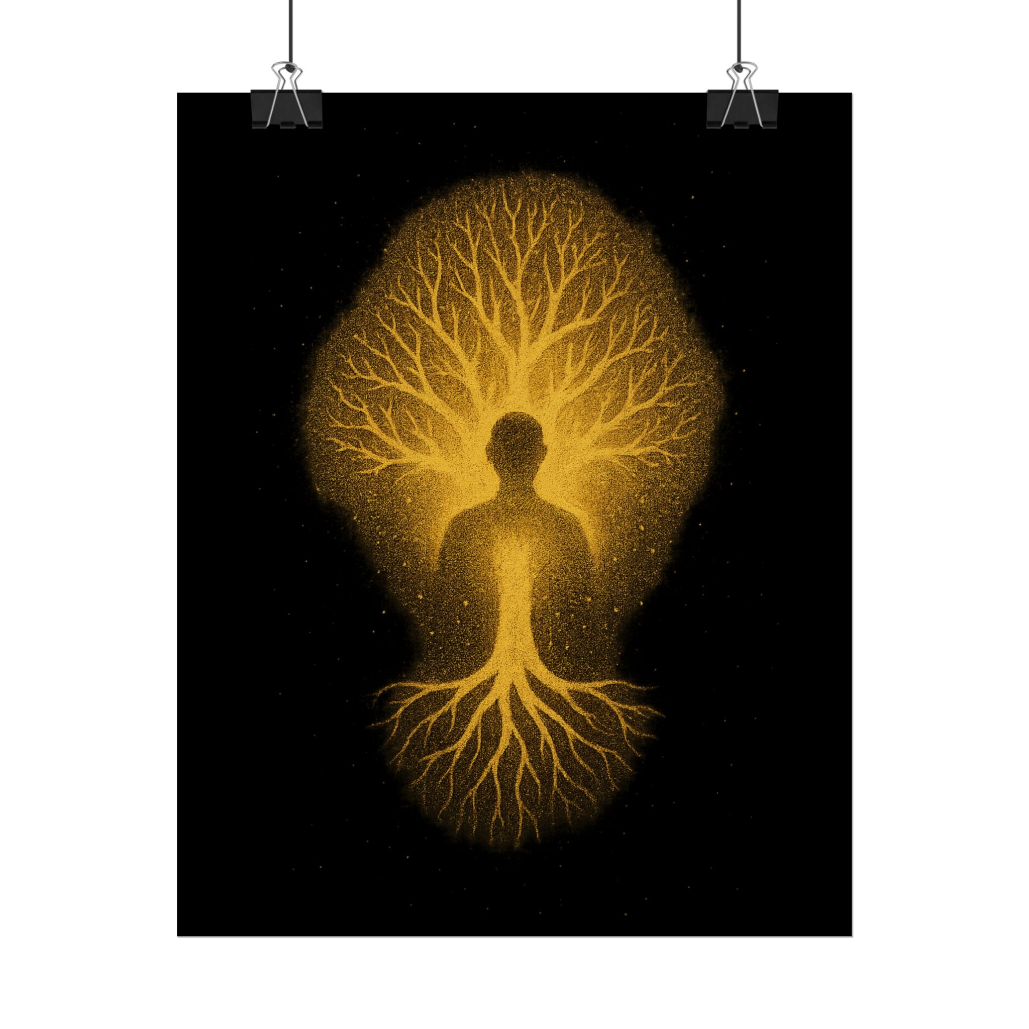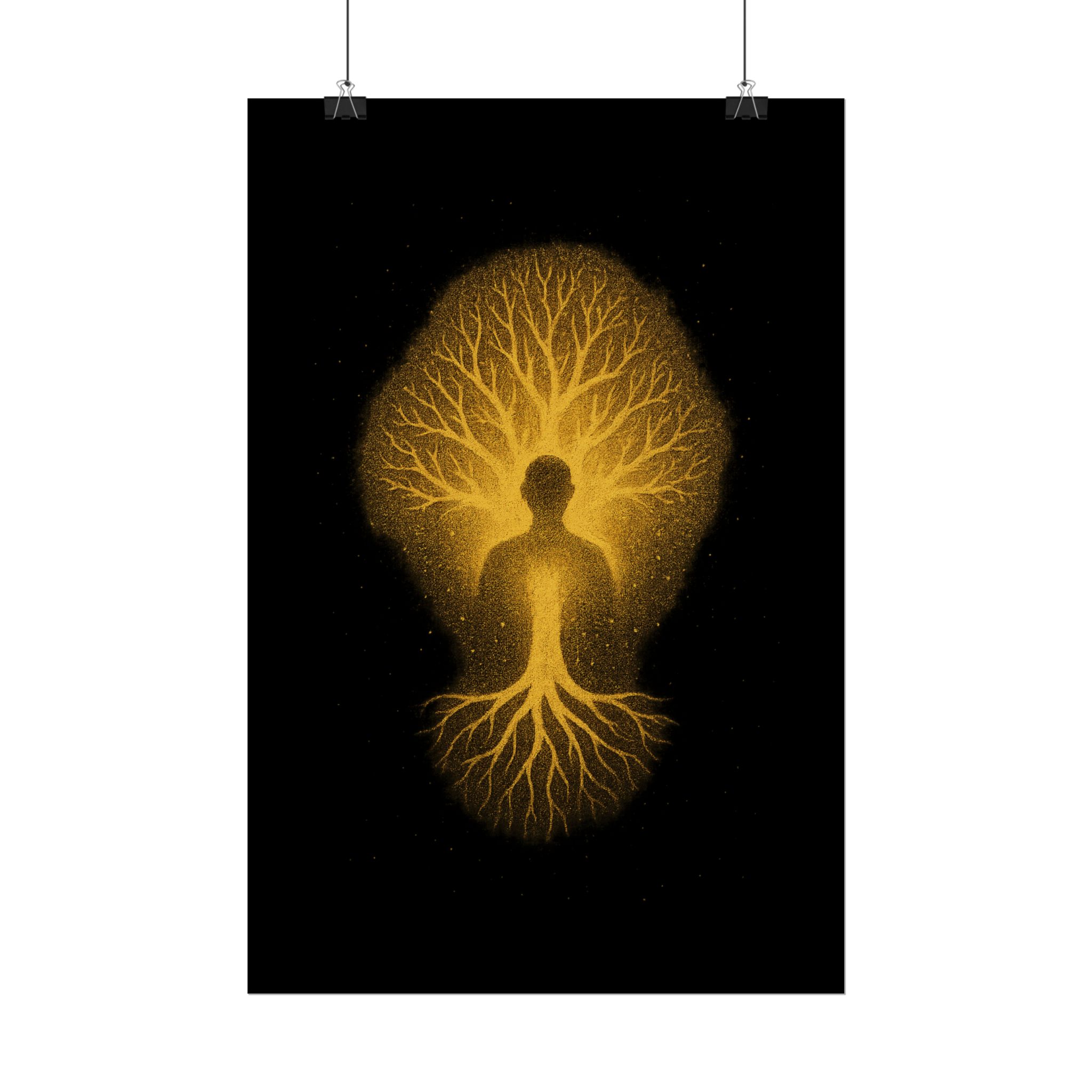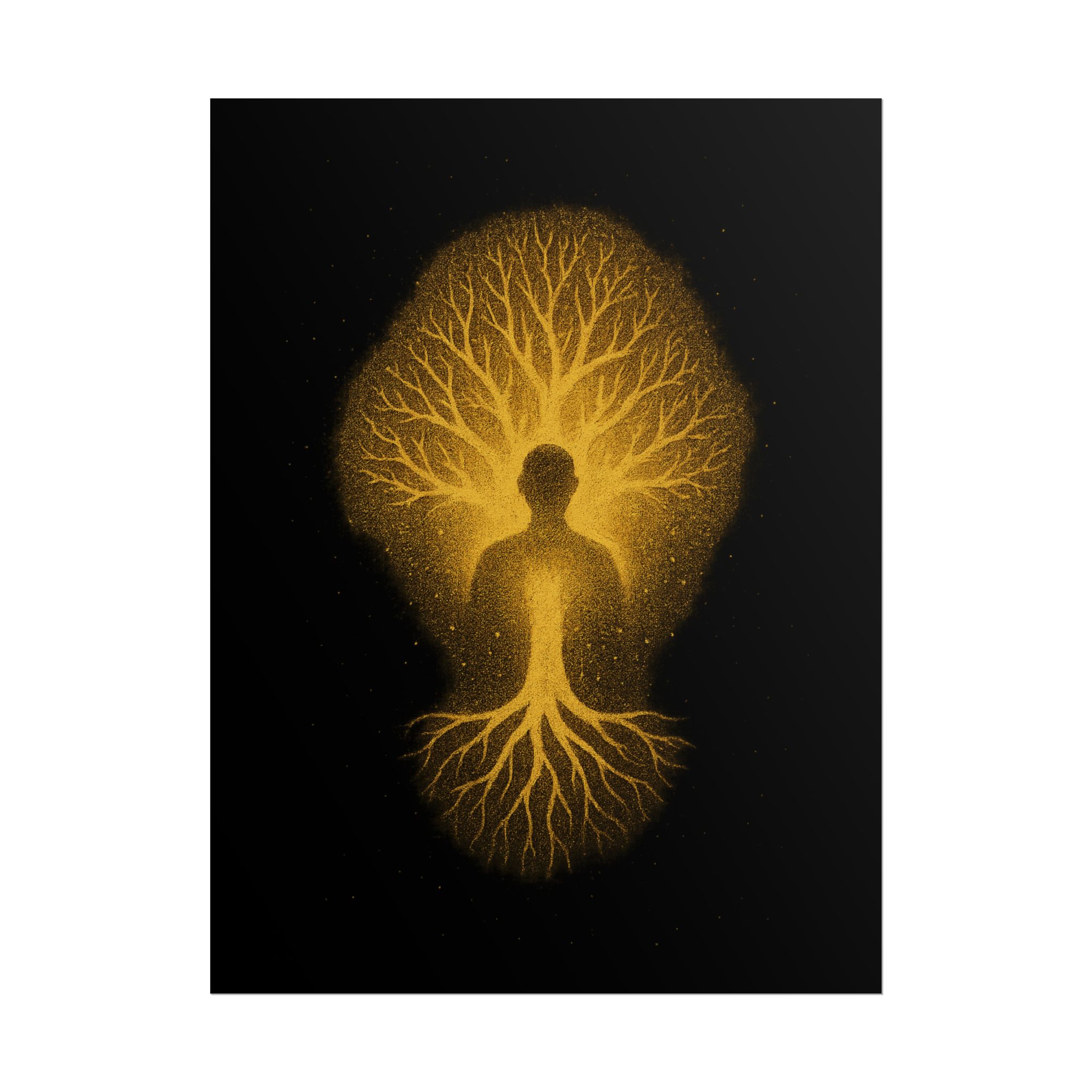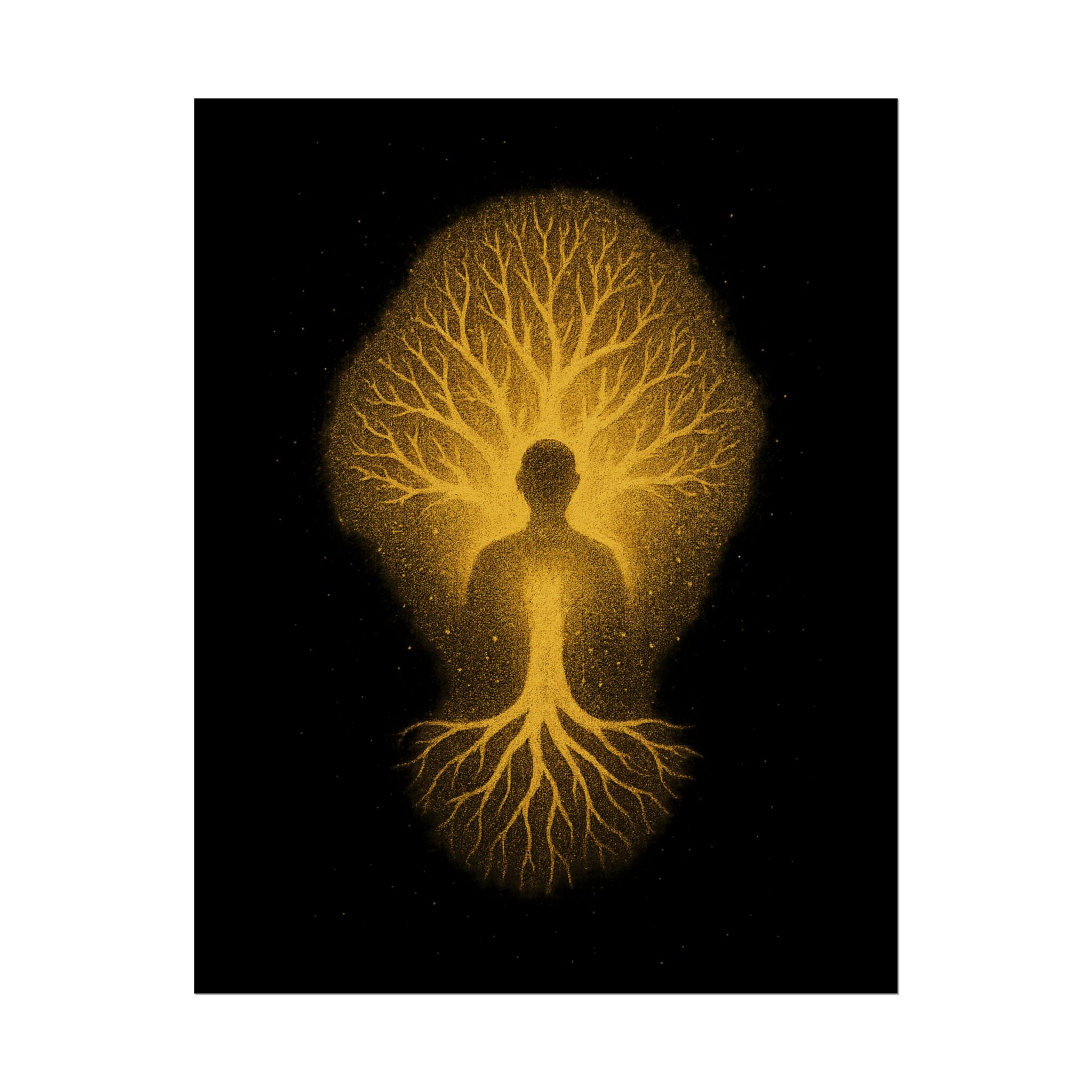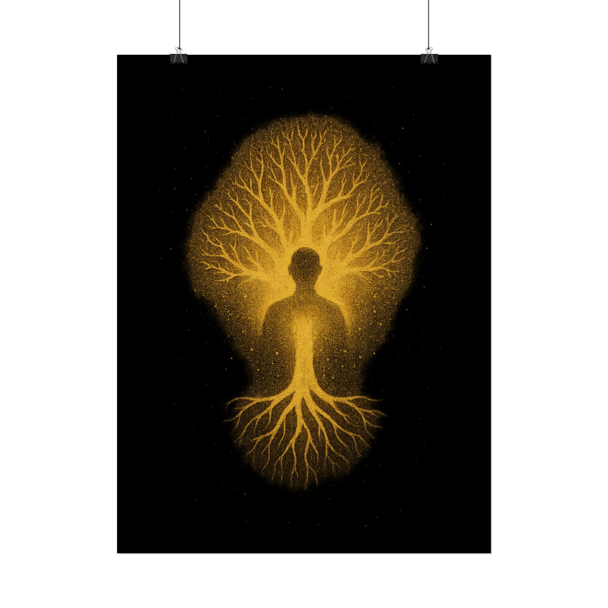 A rolled art print that brings a quiet, meditative energy into any room. The glowing gold silhouette melds a human figure with a branching tree of roots and crown, printed on your choice of fine art, semi-glossy, or matte paper. Colors are produced with giclée printing for vivid, lasting pigment so the luminous gold remains striking under regular light. Shipped rolled to protect the paper and easy to frame or pin up as-is, this print suits both vertical and horizontal displays and comes in multiple sizes to fit walls small and large.
