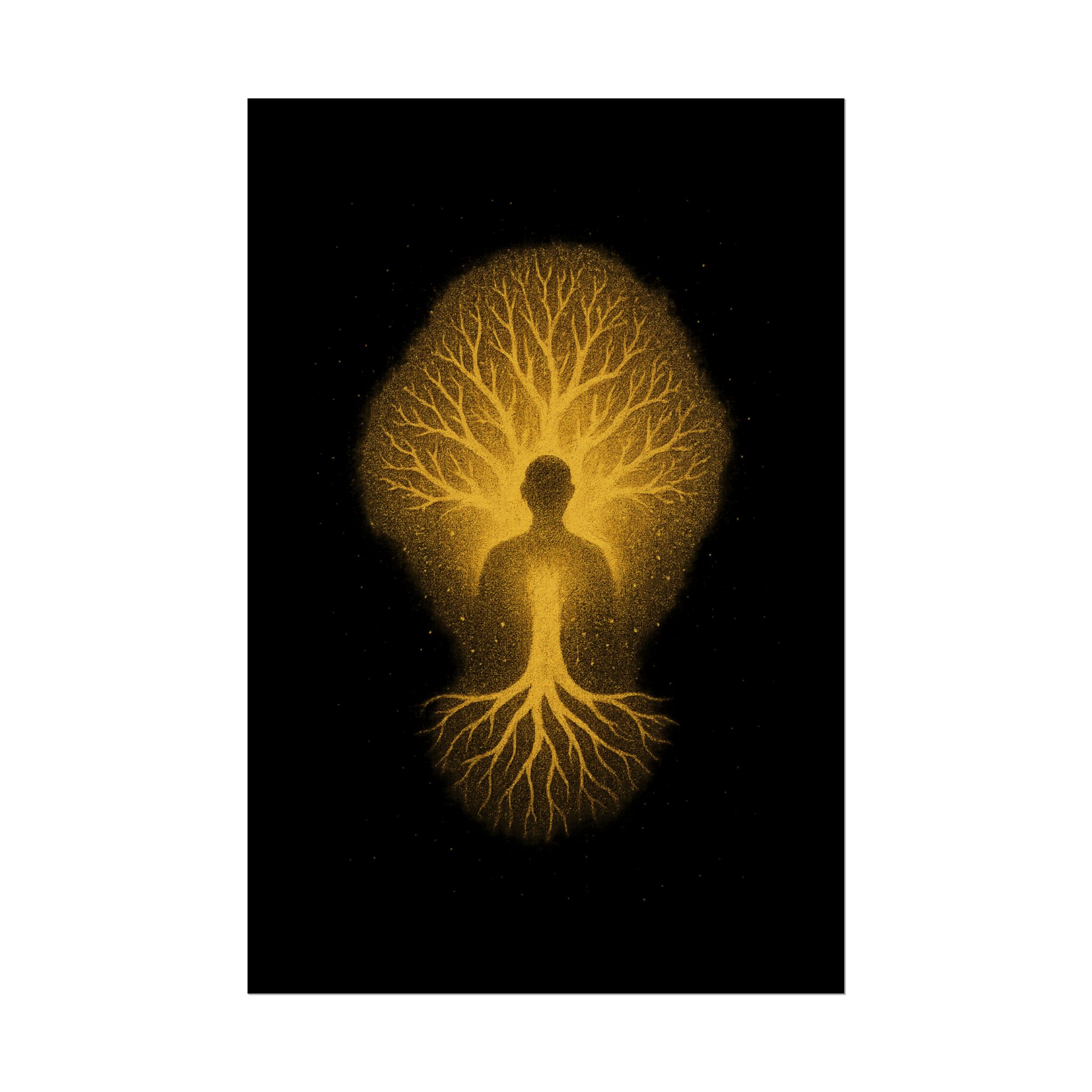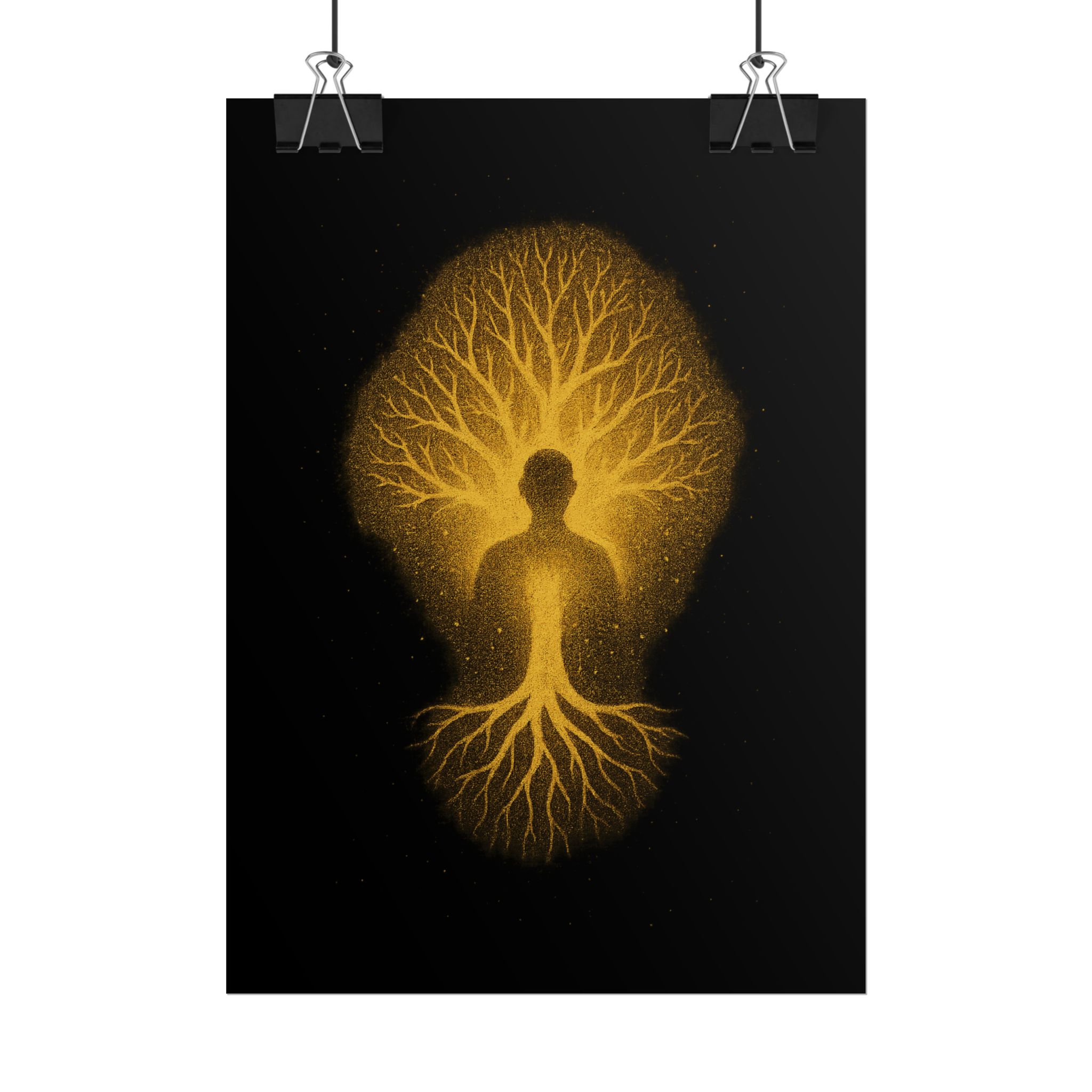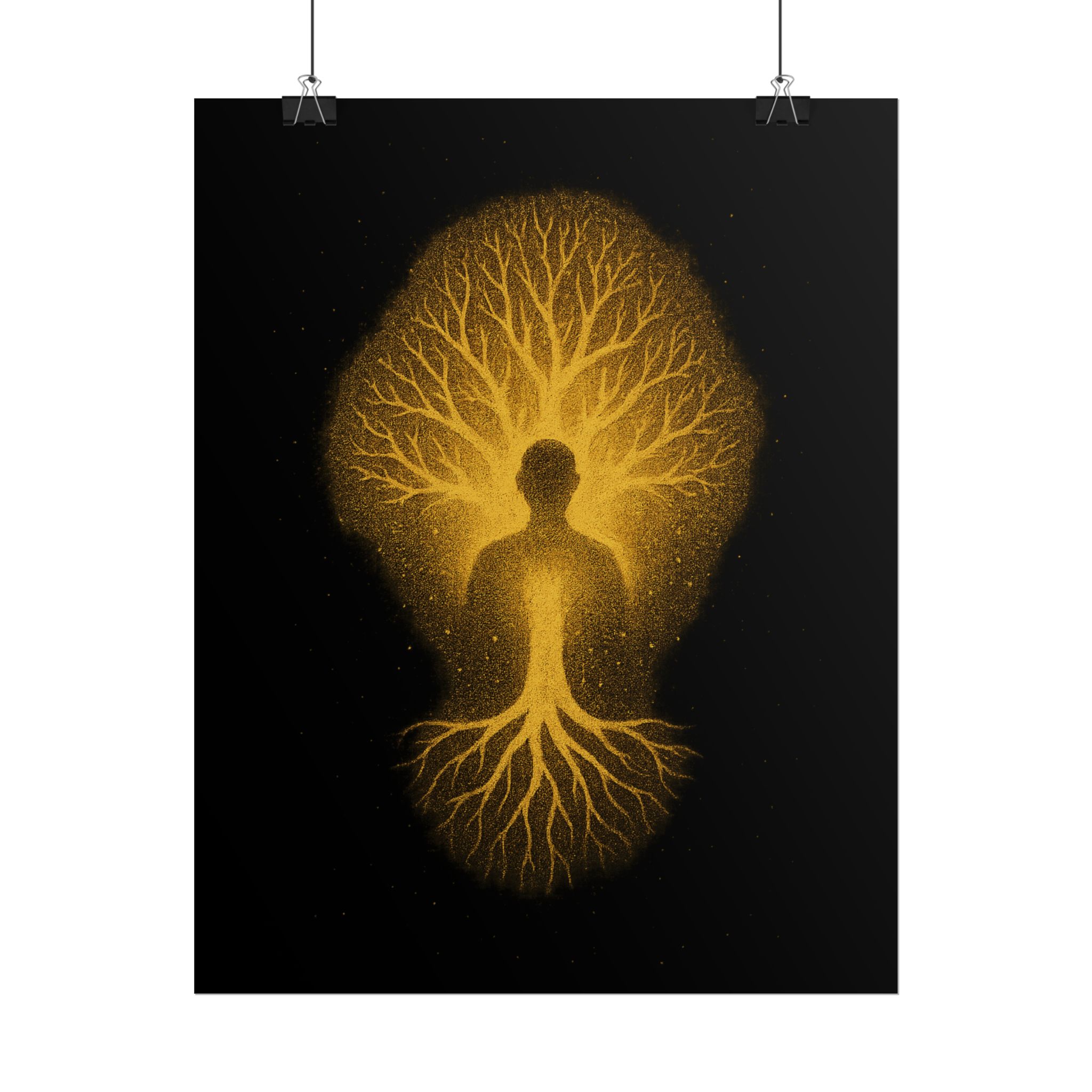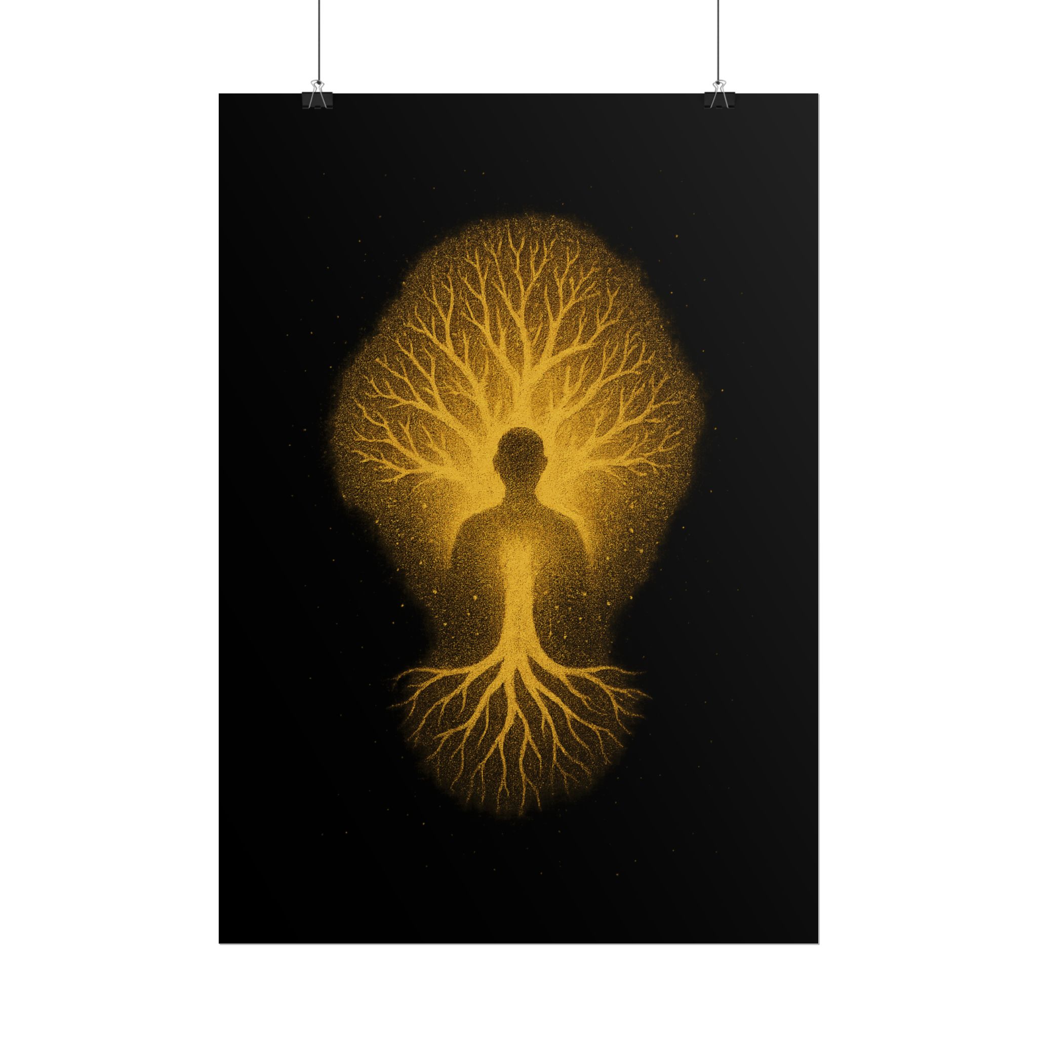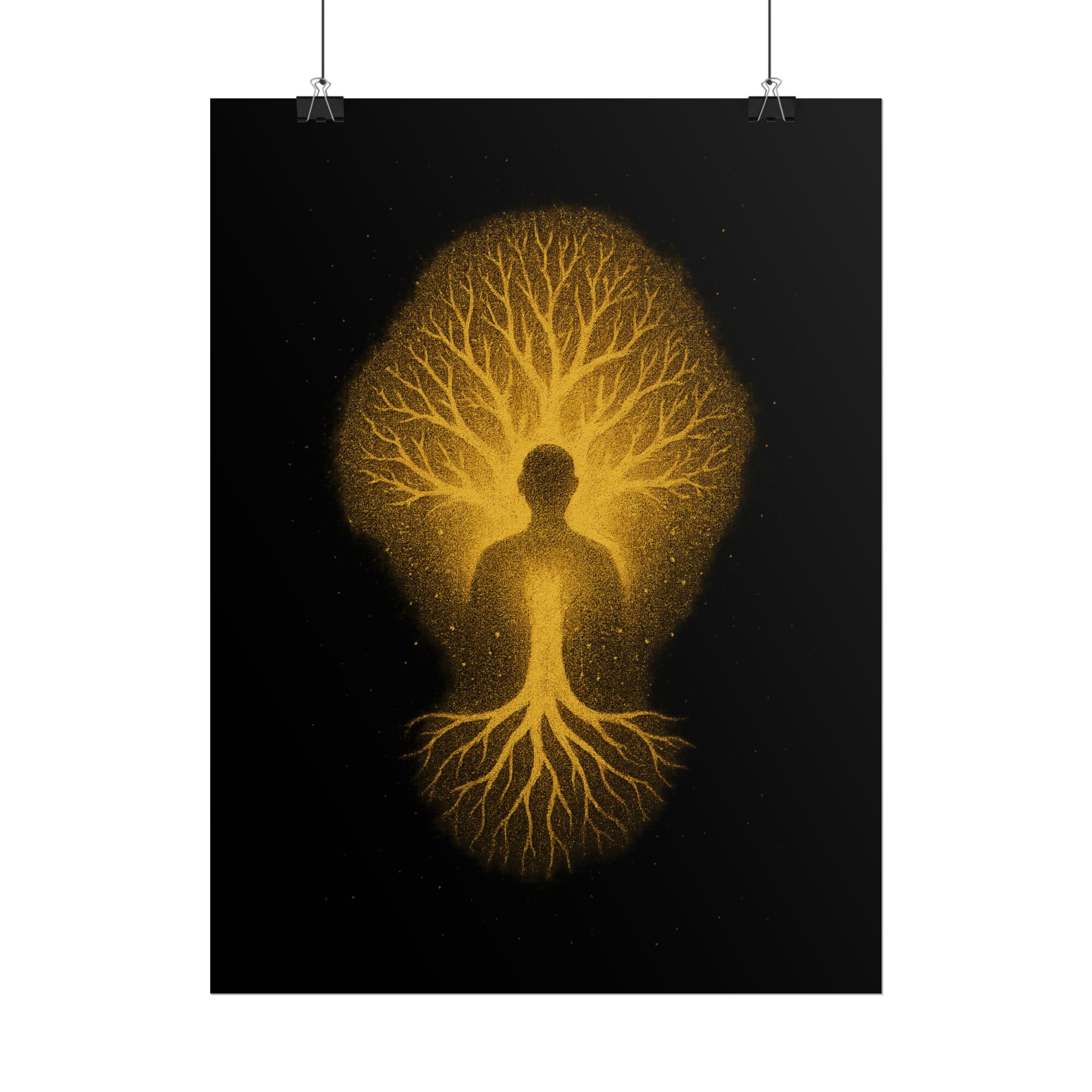 A rolled art print that brings a quiet, meditative energy into any room. The glowing gold silhouette melds a human figure with a branching tree of roots and crown, printed on your choice of fine art, semi-glossy, or matte paper. Colors are produced with giclée printing for vivid, lasting pigment so the luminous gold remains striking under regular light. Shipped rolled to protect the paper and easy to frame or pin up as-is, this print suits both vertical and horizontal displays and comes in multiple sizes to fit walls small and large.