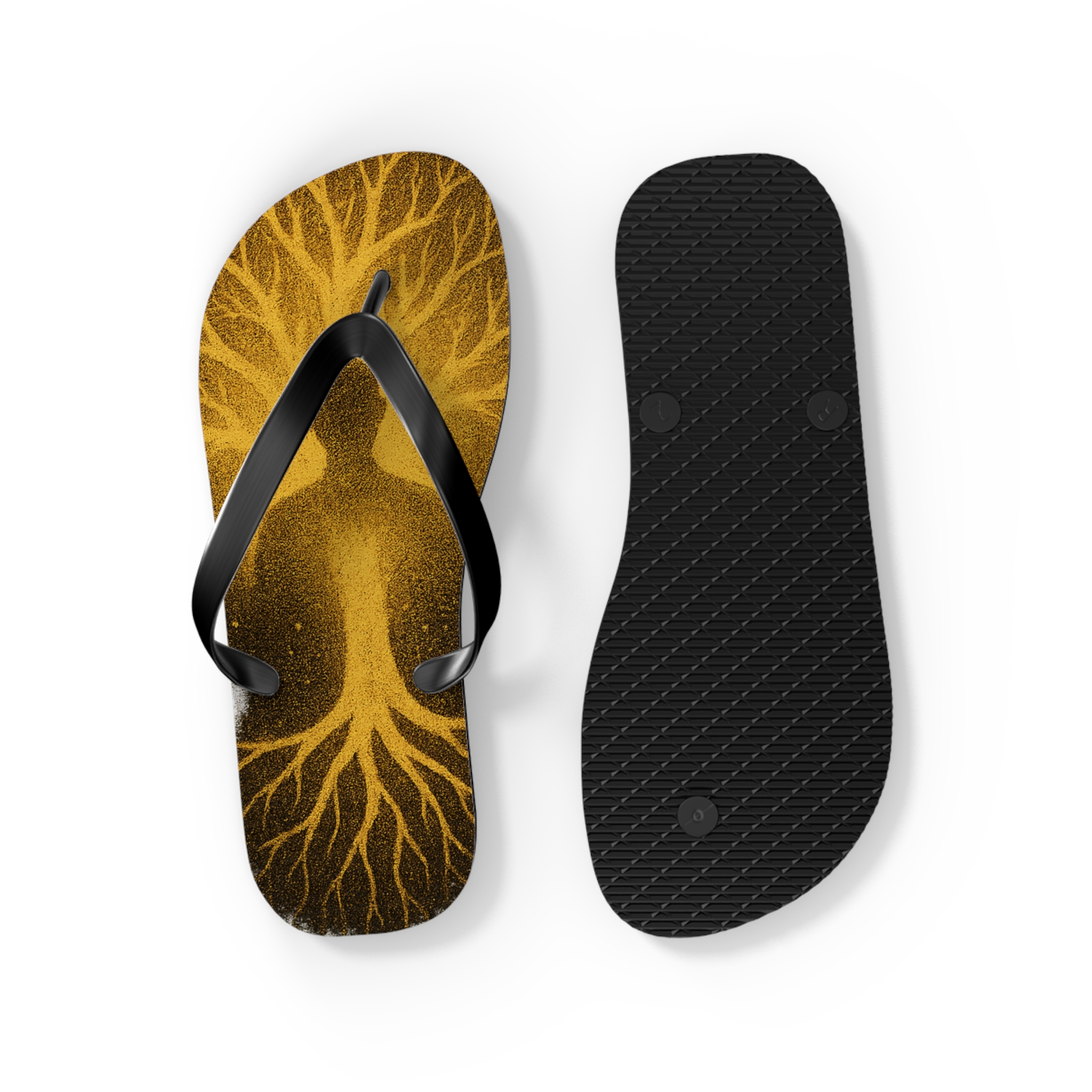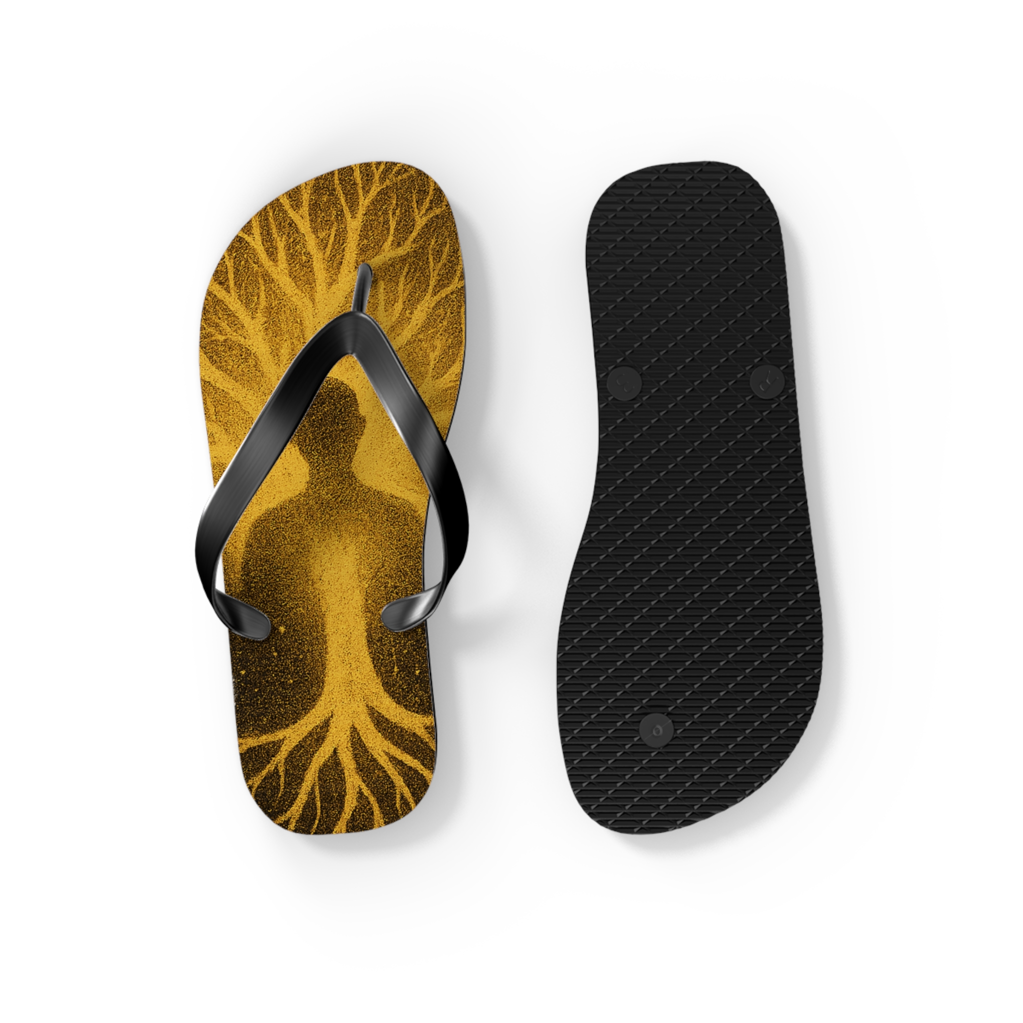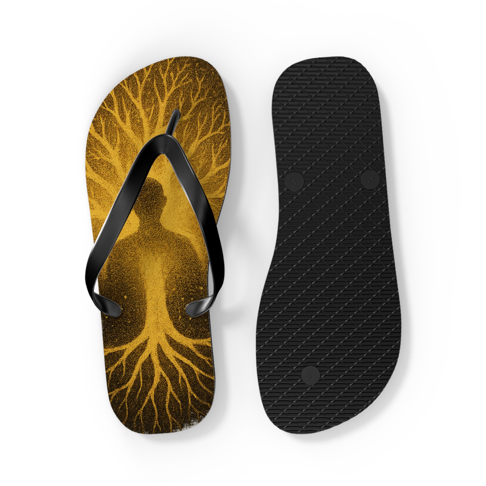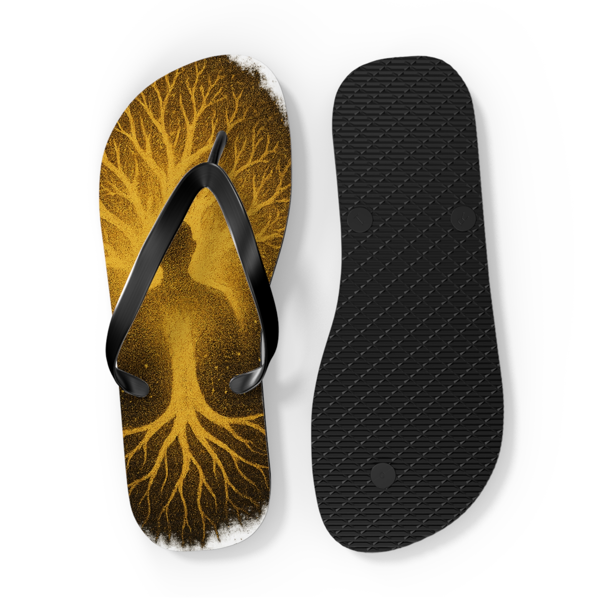 Walk into sunlight with grounded confidence. These flip flops pair a warm, golden print of a human silhouette rooted into branching tree-like veins with lightweight, cushioned construction — a quiet reminder to stay connected to the earth while you move. The suede-like polyester top captures every swirl of color; the textured EVA sole grips wet surfaces so you can wander beaches, boardwalks, or backyard paths without hesitation. They feel soft underfoot, run true to size, and show off a bold, nature-inspired statement that fits days spent outdoors or slow mornings at home.