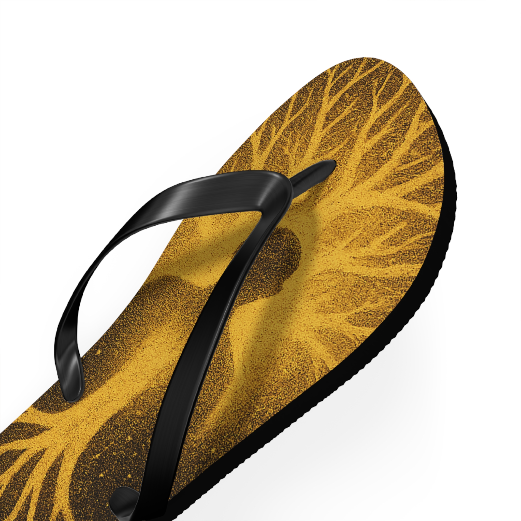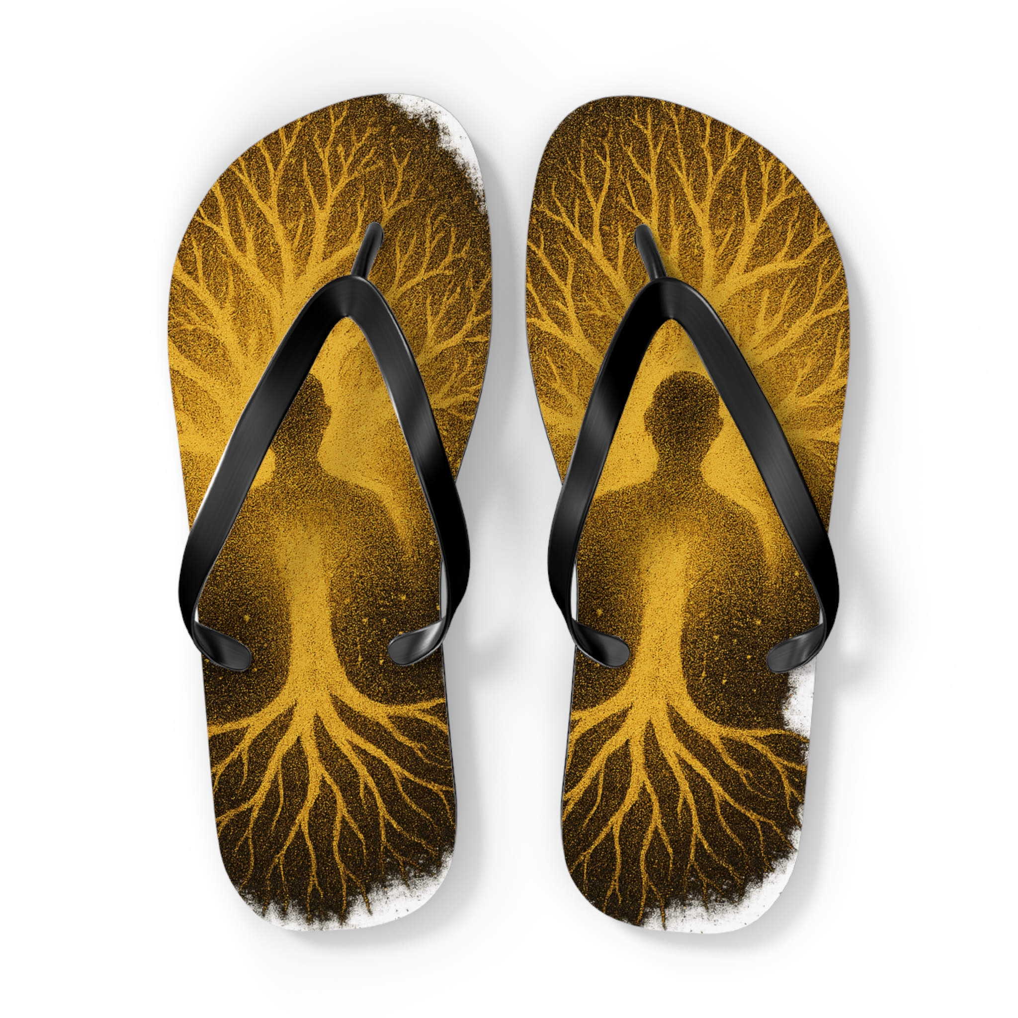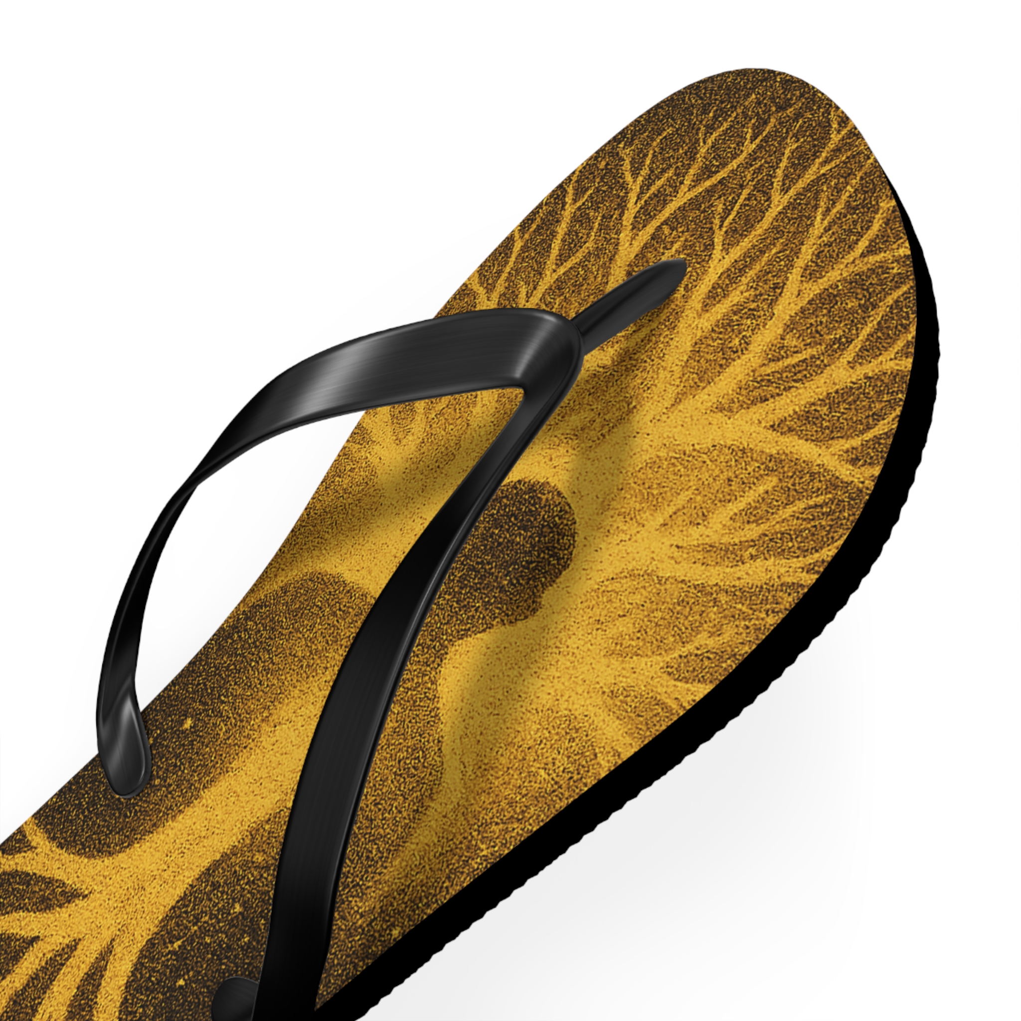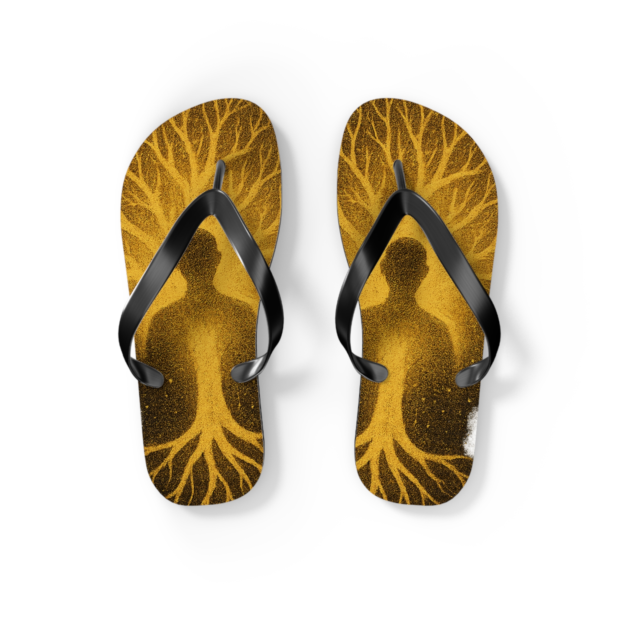 Walk into sunlight with grounded confidence. These flip flops pair a warm, golden print of a human silhouette rooted into branching tree-like veins with lightweight, cushioned construction — a quiet reminder to stay connected to the earth while you move. The suede-like polyester top captures every swirl of color; the textured EVA sole grips wet surfaces so you can wander beaches, boardwalks, or backyard paths without hesitation. They feel soft underfoot, run true to size, and show off a bold, nature-inspired statement that fits days spent outdoors or slow mornings at home.