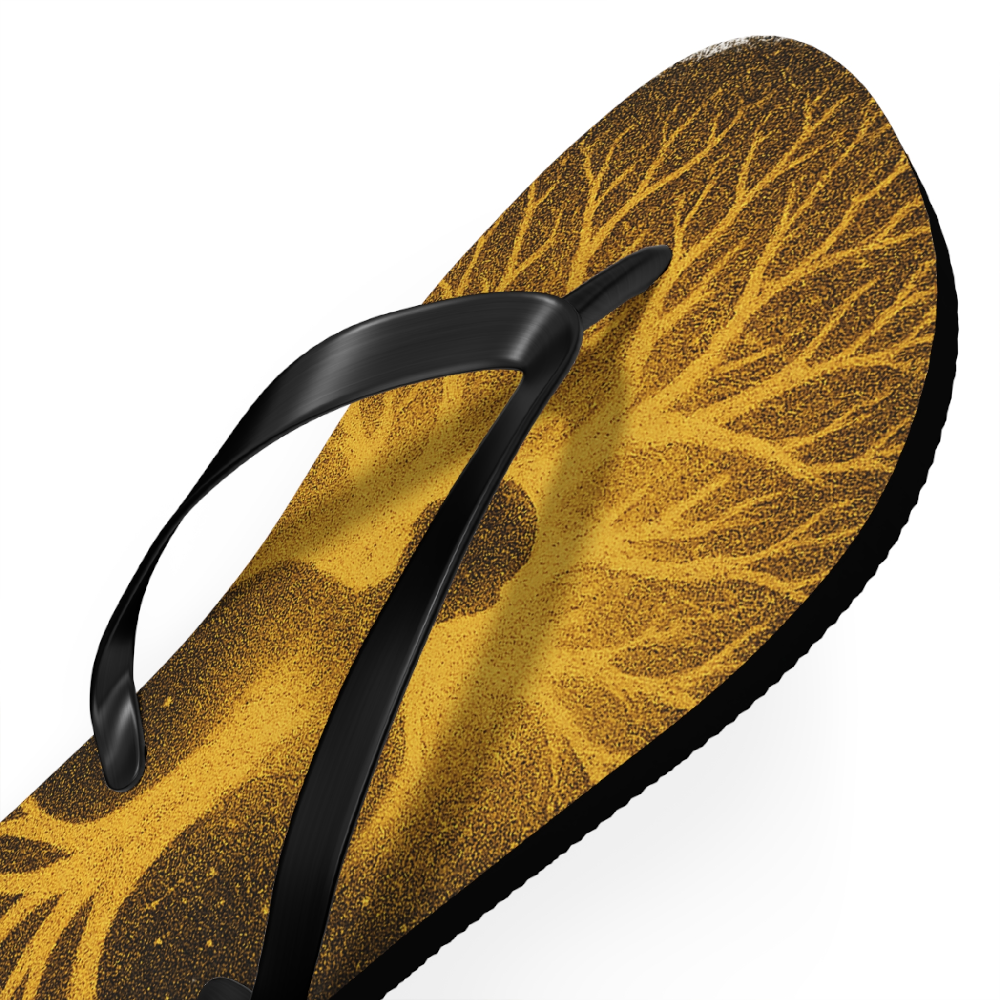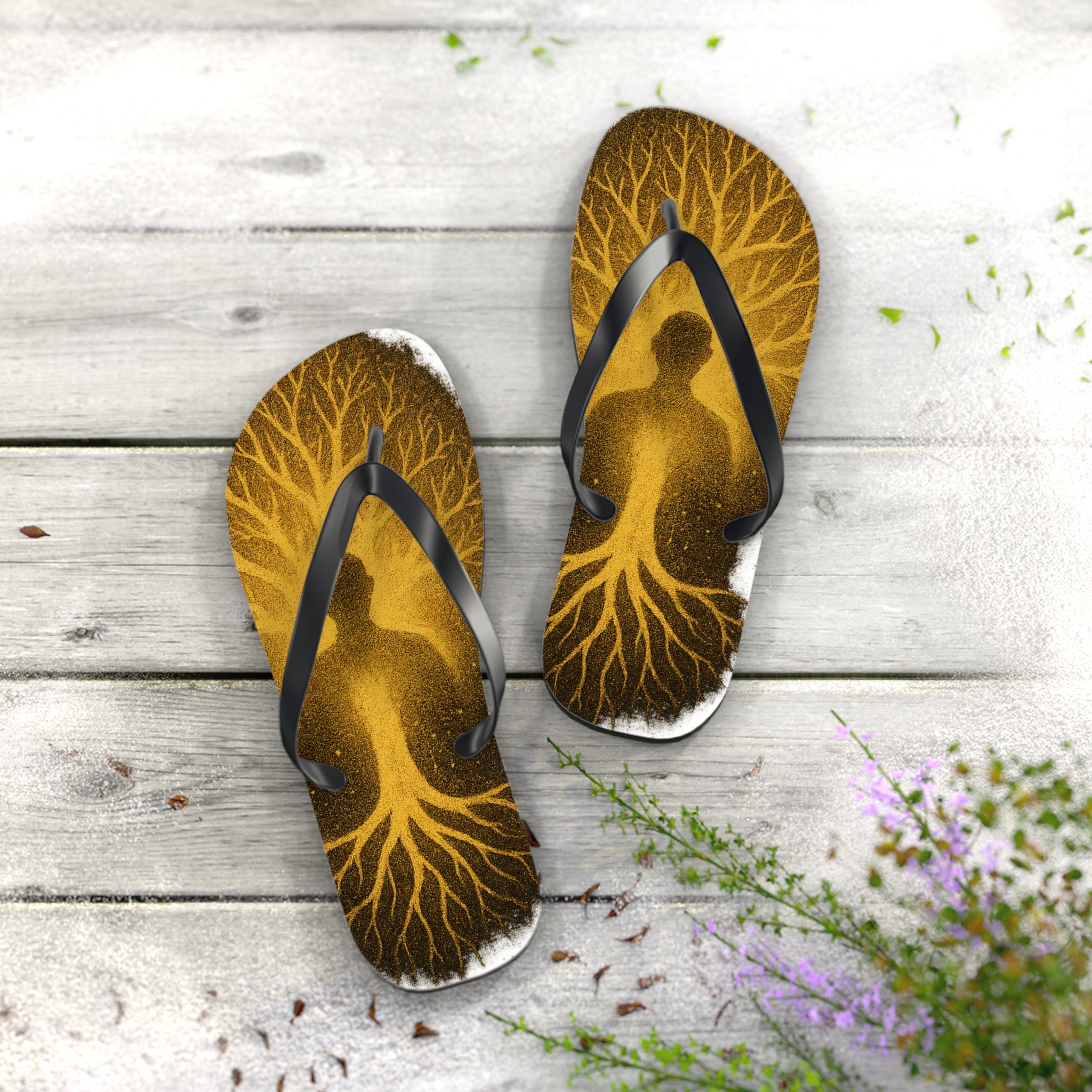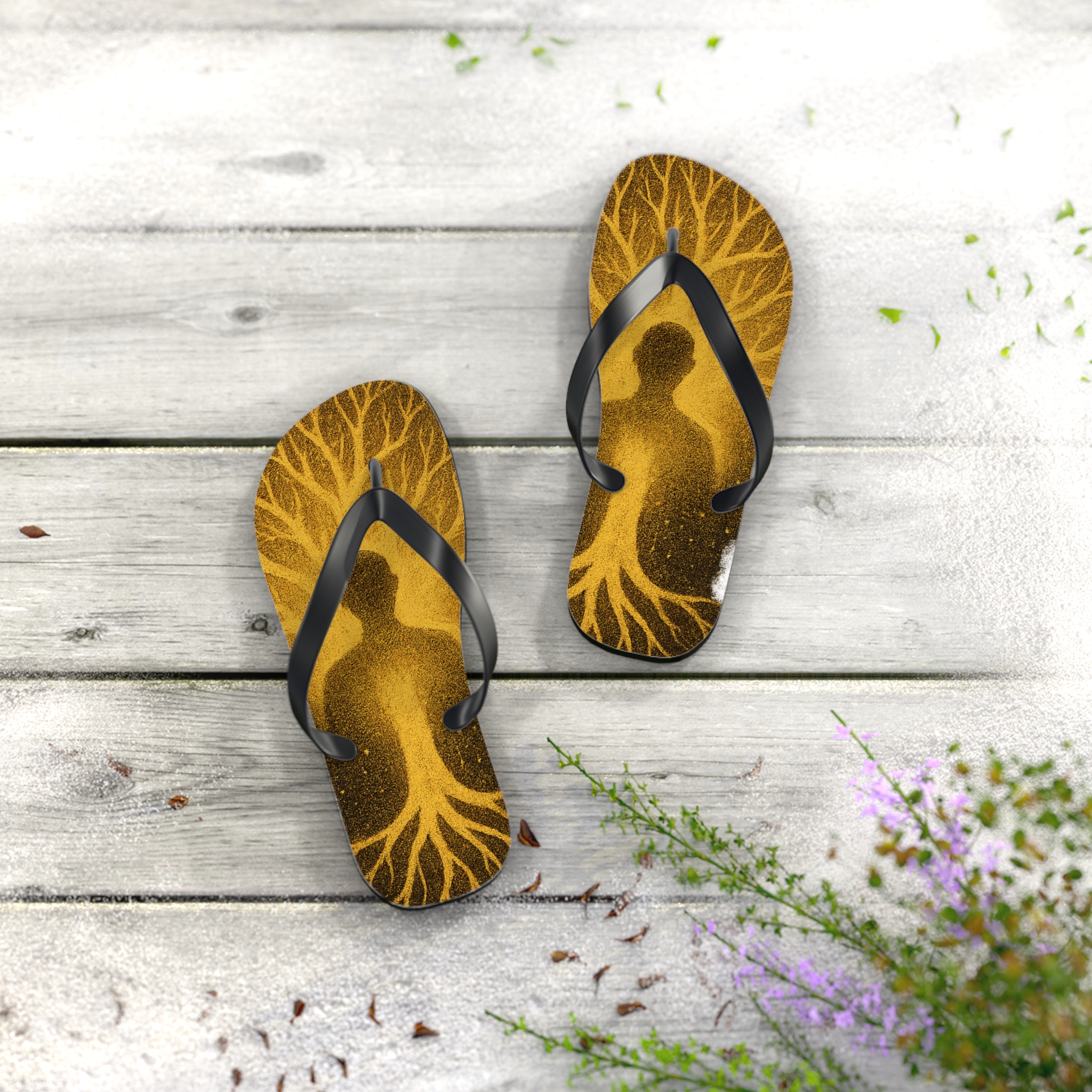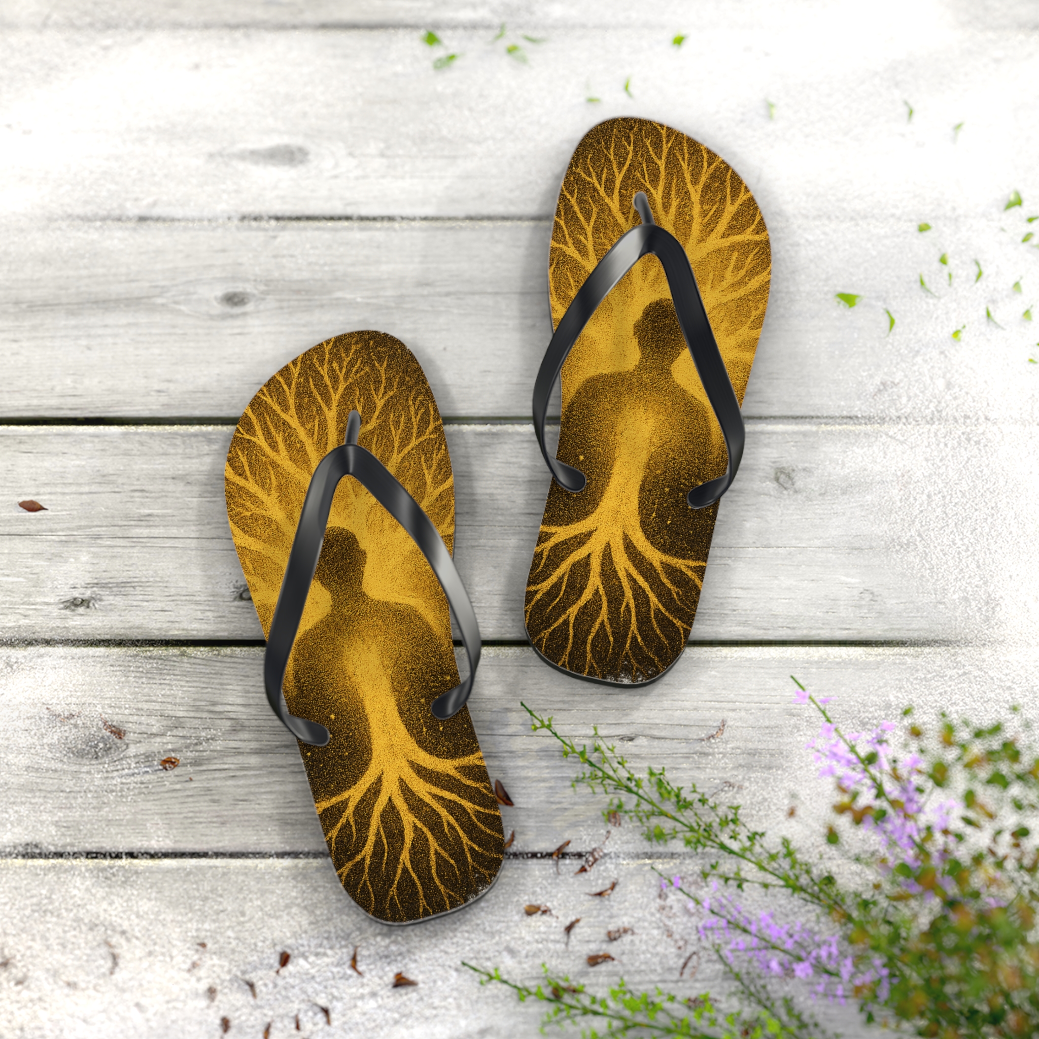 Walk into sunlight with grounded confidence. These flip flops pair a warm, golden print of a human silhouette rooted into branching tree-like veins with lightweight, cushioned construction — a quiet reminder to stay connected to the earth while you move. The suede-like polyester top captures every swirl of color; the textured EVA sole grips wet surfaces so you can wander beaches, boardwalks, or backyard paths without hesitation. They feel soft underfoot, run true to size, and show off a bold, nature-inspired statement that fits days spent outdoors or slow mornings at home.